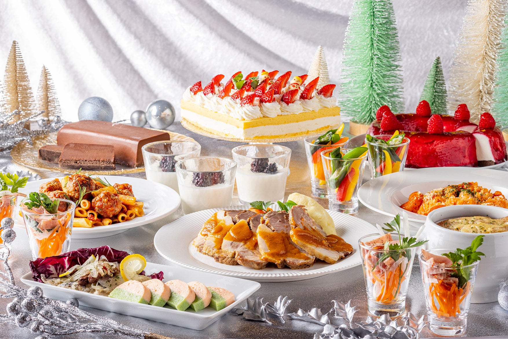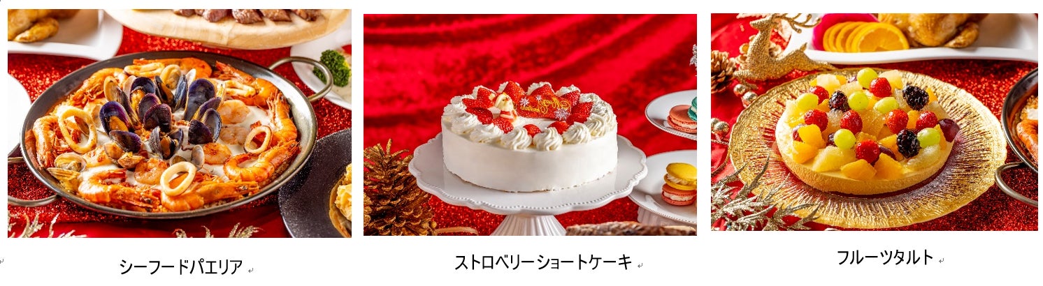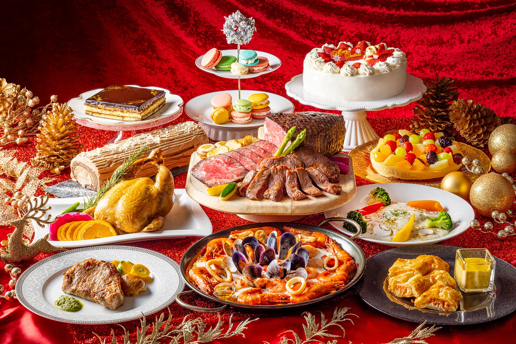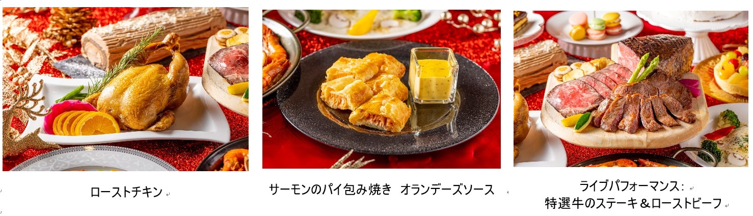 ライブパフォーマンス:特選牛のステーキ&ローストビーフ、パテ・ド・カンパーニュ、甘海老と帆立のテリーヌ、キッシュロレーヌ、スモークターキー、サーモンとアボカドのタルタル、野菜のバーニャカウダ クリスマス風、ポークコンフィ サルサヴェルデ、サーモンのパイ包み焼き オランデーズソース、舌平目のポンファム、ピッツァ2種、ローストチキン オレンジソース、仔羊モモ肉のスぺッツァティーノ、スモークサーモンといくらのクリームパスタ、ラザニア クリスマスカラーの野菜添え、リードヴォーと茸のフリカッセ、シーフードパエリア、マンハッタンクラムチャウダーほか