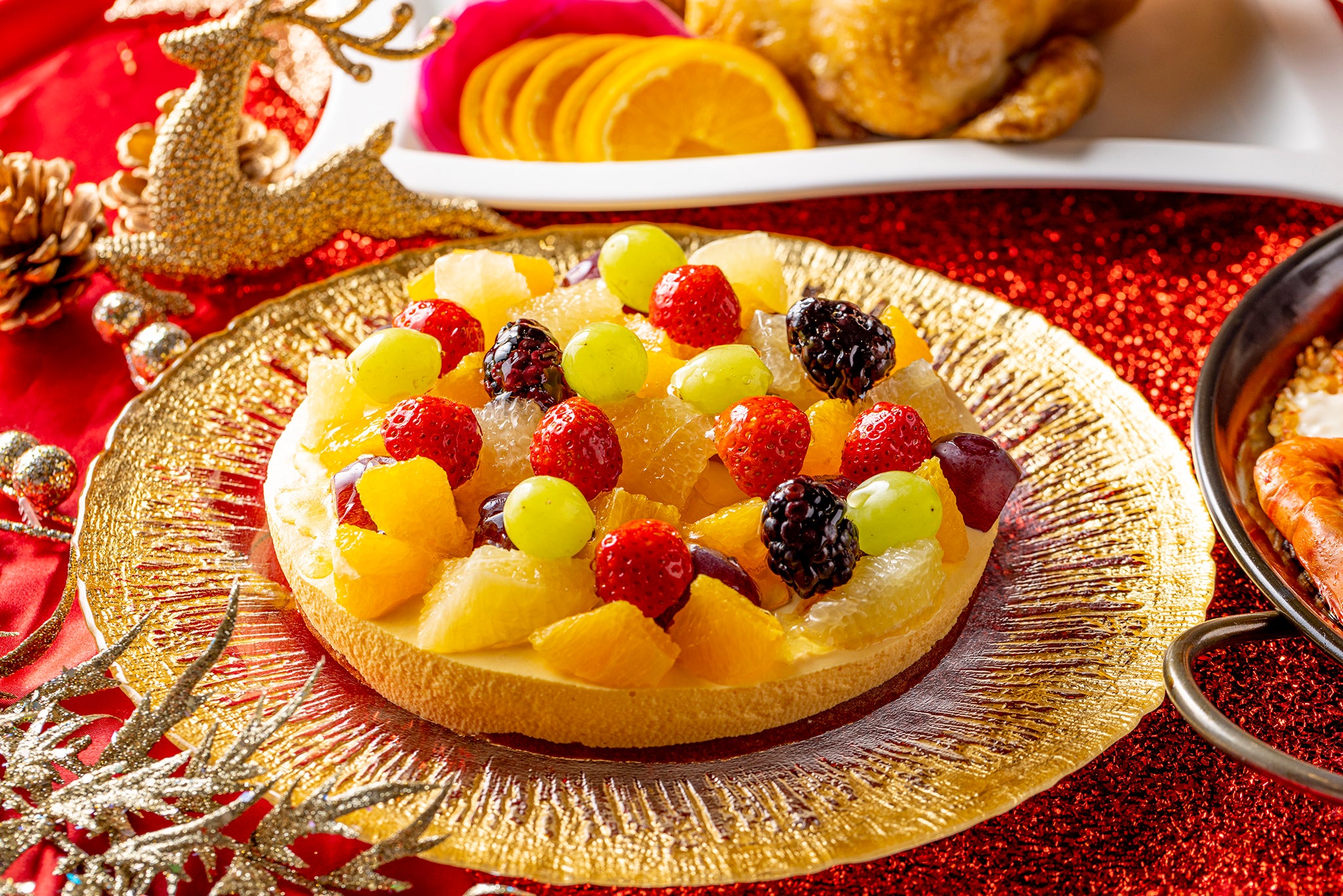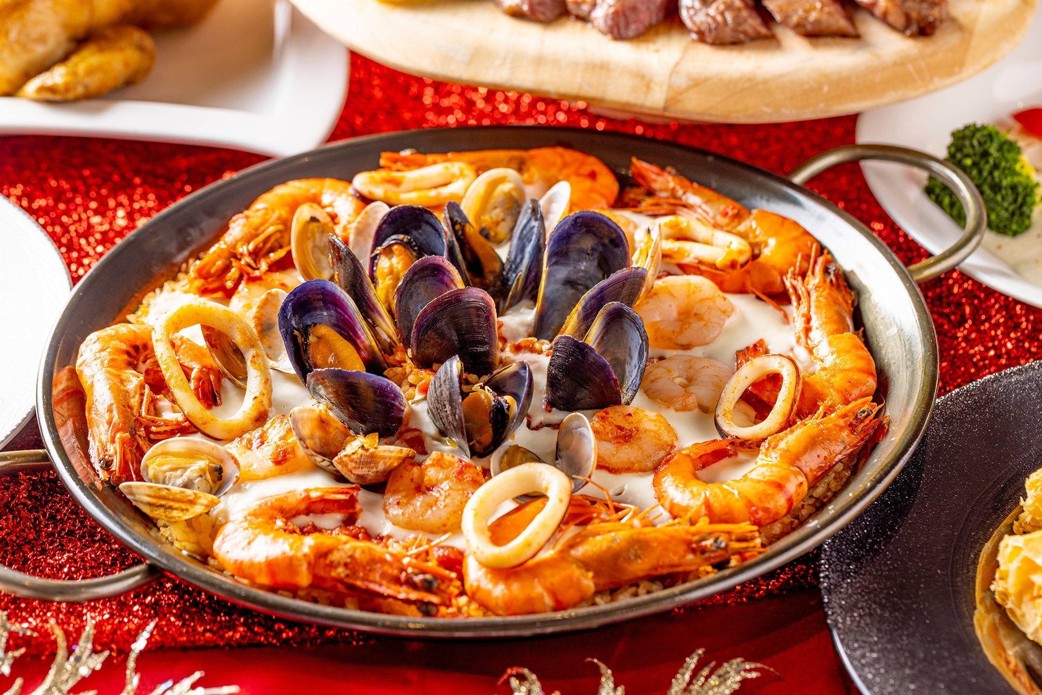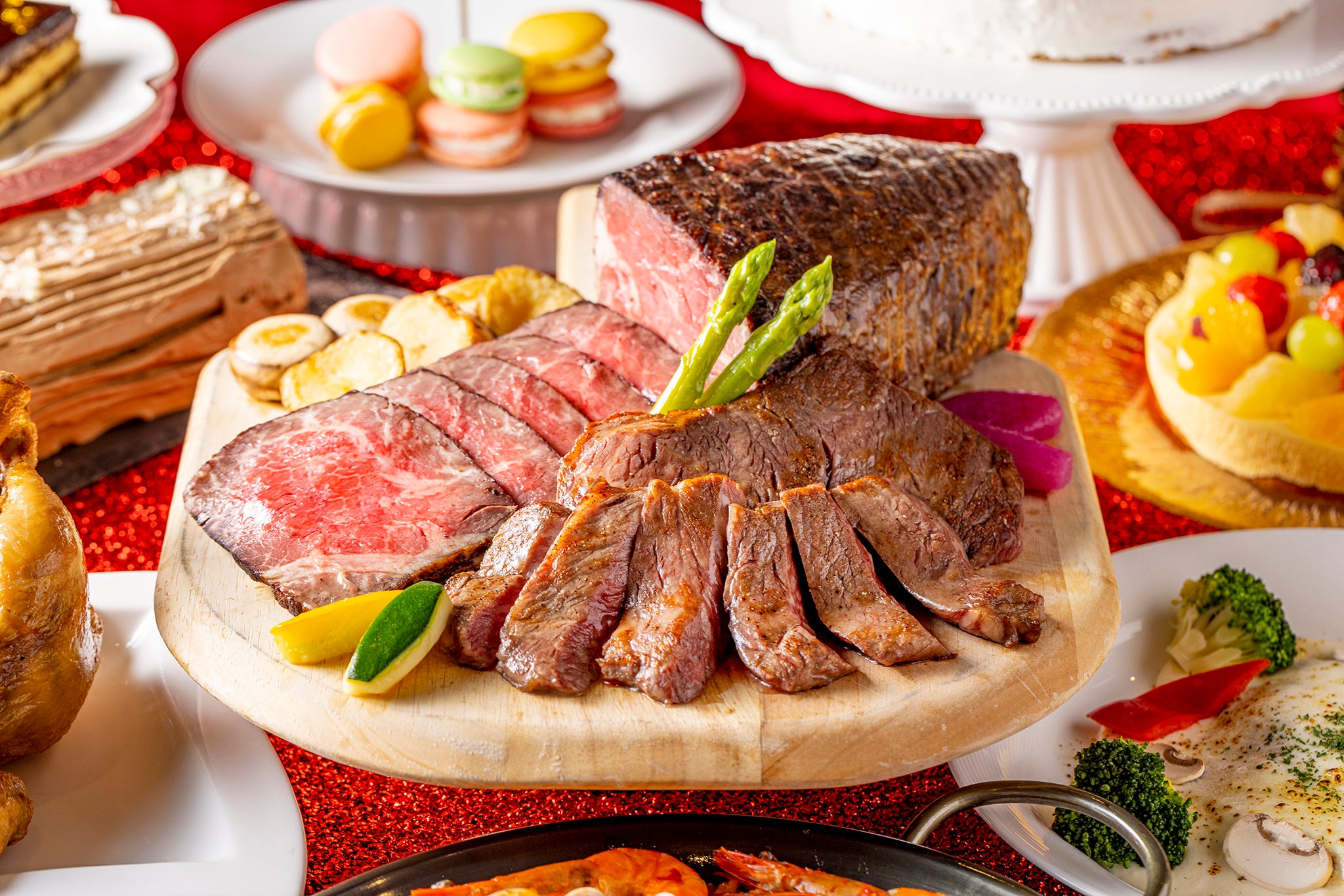 ライブパフォーマンス:特選牛のステーキ&ローストビーフ、パテ・ド・カンパーニュ、甘海老と帆立のテリーヌ、キッシュロレーヌ、スモークターキー、サーモンとアボカドのタルタル、野菜のバーニャカウダ クリスマス風、ポークコンフィ サルサヴェルデ、サーモンのパイ包み焼き オランデーズソース、舌平目のポンファム、ピッツァ2種、ローストチキン オレンジソース、仔羊モモ肉のスぺッツァティーノ、スモークサーモンといくらのクリームパスタ、ラザニア クリスマスカラーの野菜添え、リードヴォーと茸のフリカッセ、シーフードパエリア、マンハッタンクラムチャウダーほか