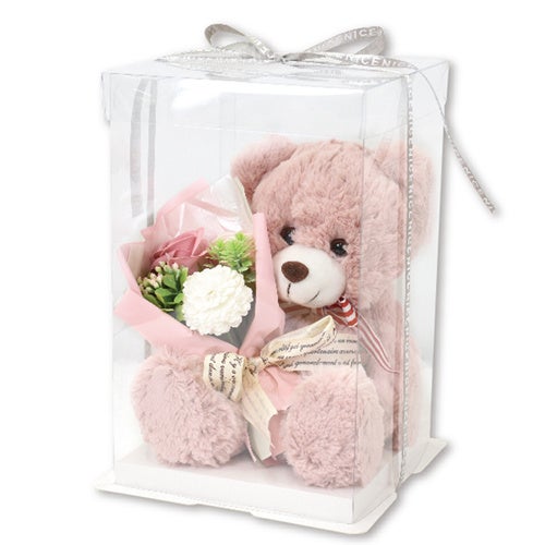 シャボンフラワーを持った、クマのぬいぐるみギフトセット。