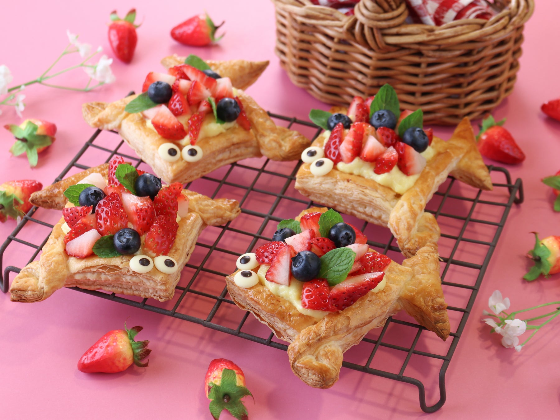 群馬県で生まれたいちご「やよいひめ」は、大粒且つ色が鮮やかで、美味しさはもちろん切り口の美しさも特徴です。魚の形にしたパイをサクサクに焼き上げて、カスタードクリームとたっぷりのやよいひめを飾ります。かわいいおさかなパイを一緒に仕上げましょう。