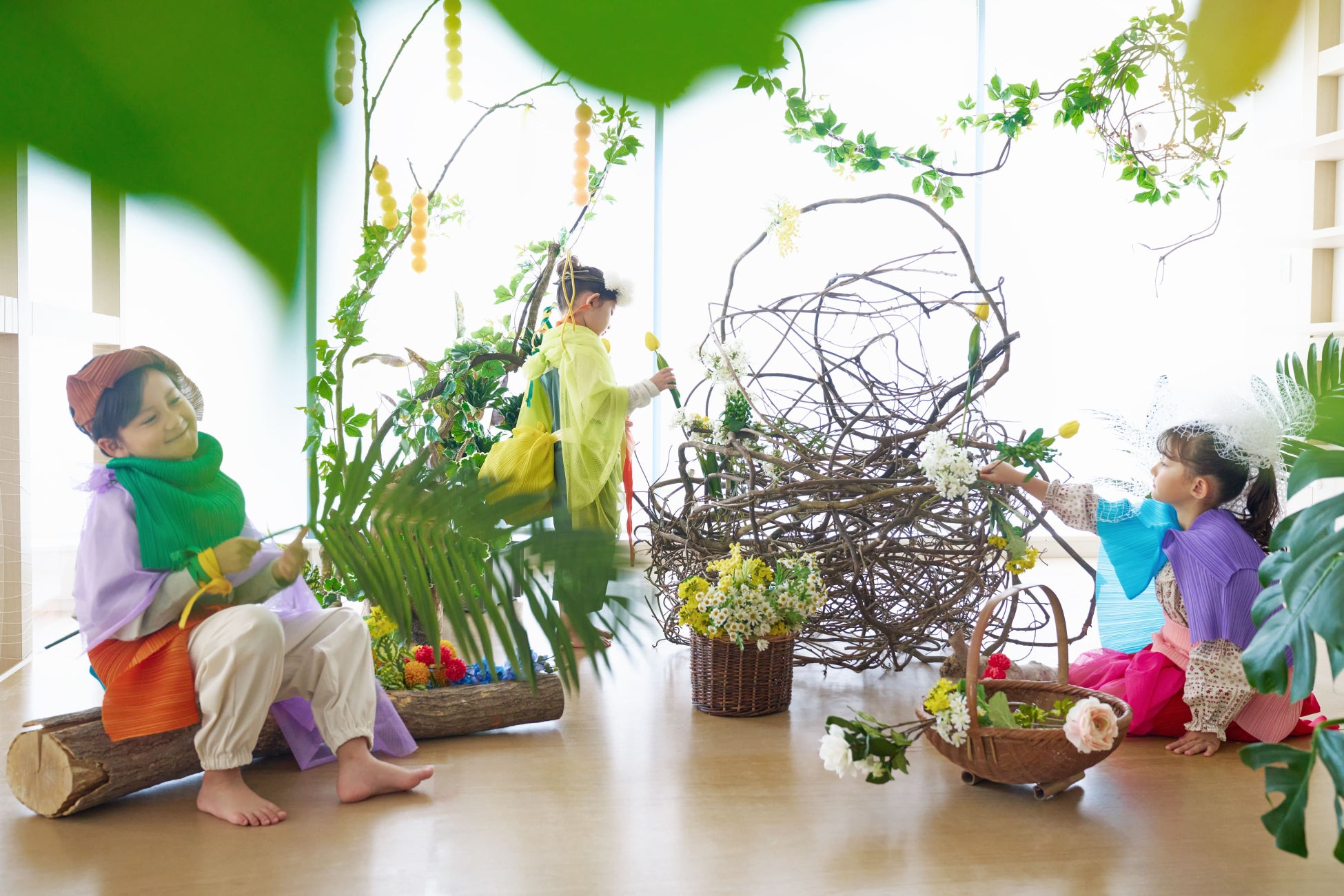 アトリエ内には、子どもの探究のきっかけを作るギャラリーがあります。今年のインスタレーション(*1)は、大阪を拠点に活躍するボタニカルアーティストがデザインします。インスタレーションのタイトルは「花と光の部屋」。ギャラリーから溢れ出すようなミモザやユーカリなどの植物に圧倒される部屋は、アーティストが4年の月日をかけて山と畑で育ててきた植物で構築した作品です。小さな入口をくぐった先には、あたたかな木漏れ日が子どもたちを迎え入れ、360度花に囲まれた空間が広がります。生花を使用するため、花と葉っぱの香り、自然との一体感や植物の持つ生命力を感じることができ、春の訪れを味わえます。展示期間を通して少しずつ変わる植物の色を楽しめることも特徴のひとつです。