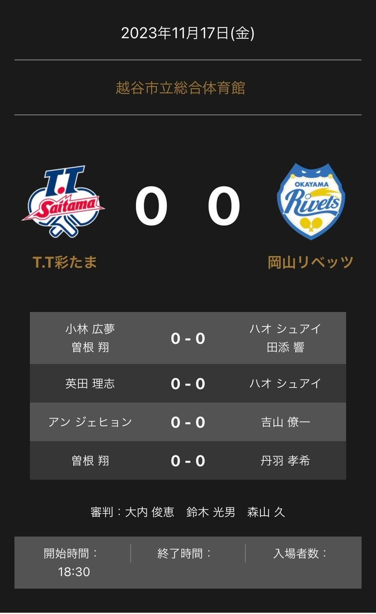 ノジマTリーグ2023-2024シーズン公式戦 11月17日(金)18:30試合開始 T.T彩たま vs 岡山リベッツ 対戦オーダー発表