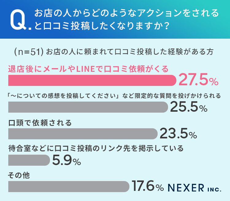 もっとも多かったのは「退店後にメールやLINEで口コミ依頼がくる」で、27.5%の方が回答しています。