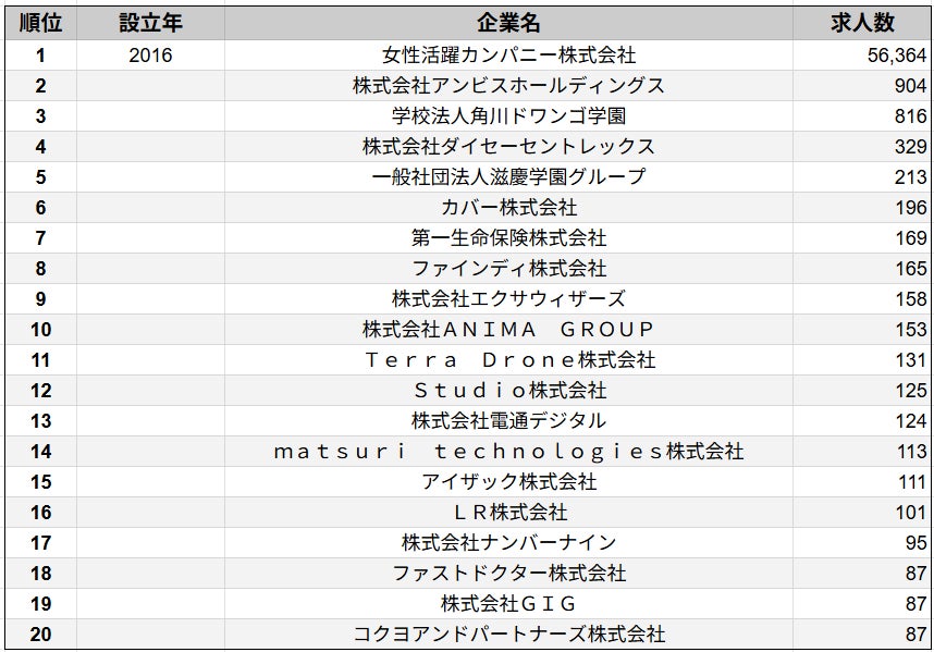 株式会社SalesNow(本社:東京都渋谷区、代表取締役:村岡功規、以下「当社」)は、国内540万社の企業情報を完全網羅した日本最大級のデータベース「SalesNow DB」より、2024年4月1日〜2025年4月1日の期間における求人データ(※アルバイト媒体を除く)をもとに、「2016年設立企業」における求人数ランキングTOP20を集計・発表いたしました。