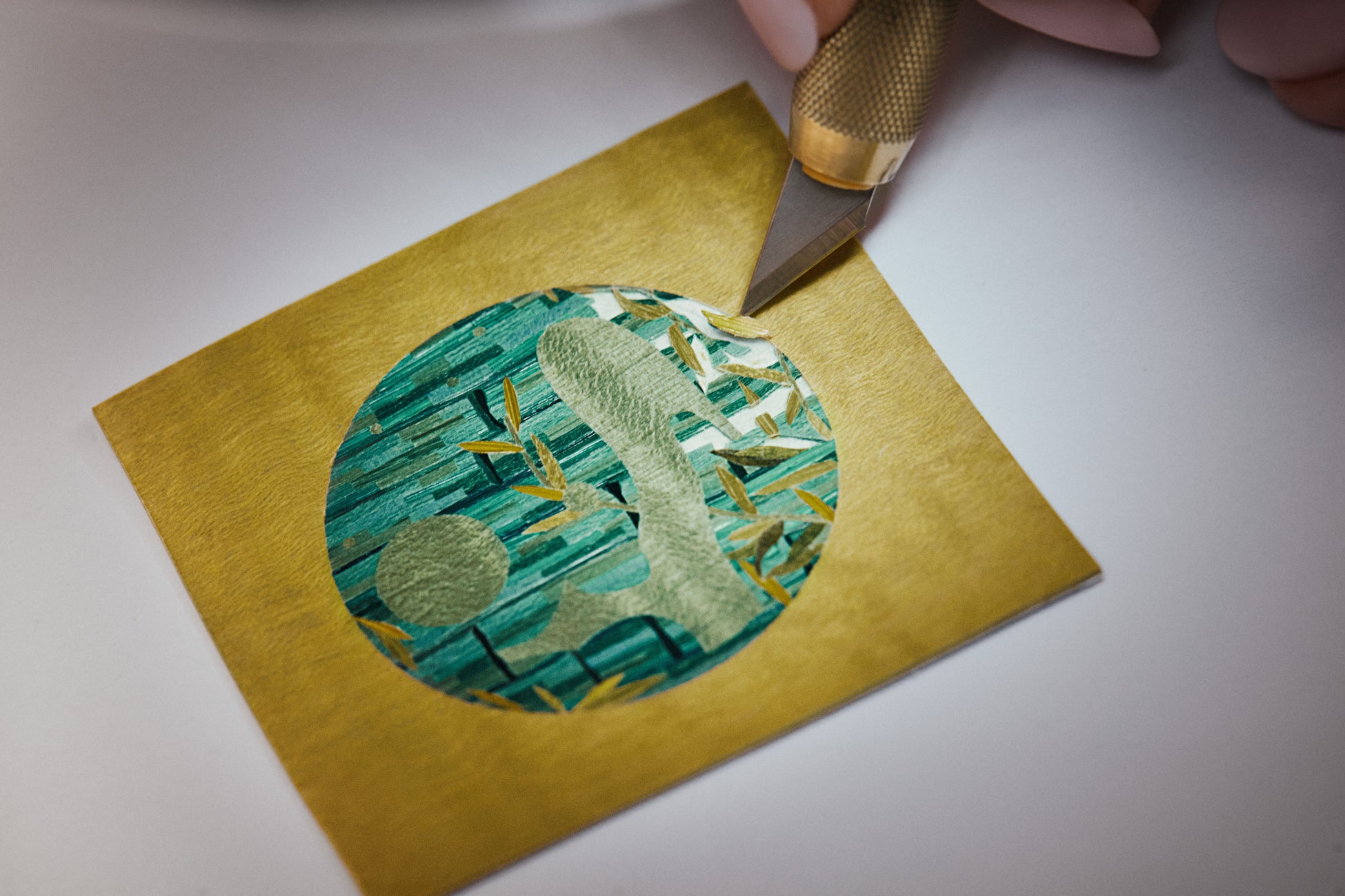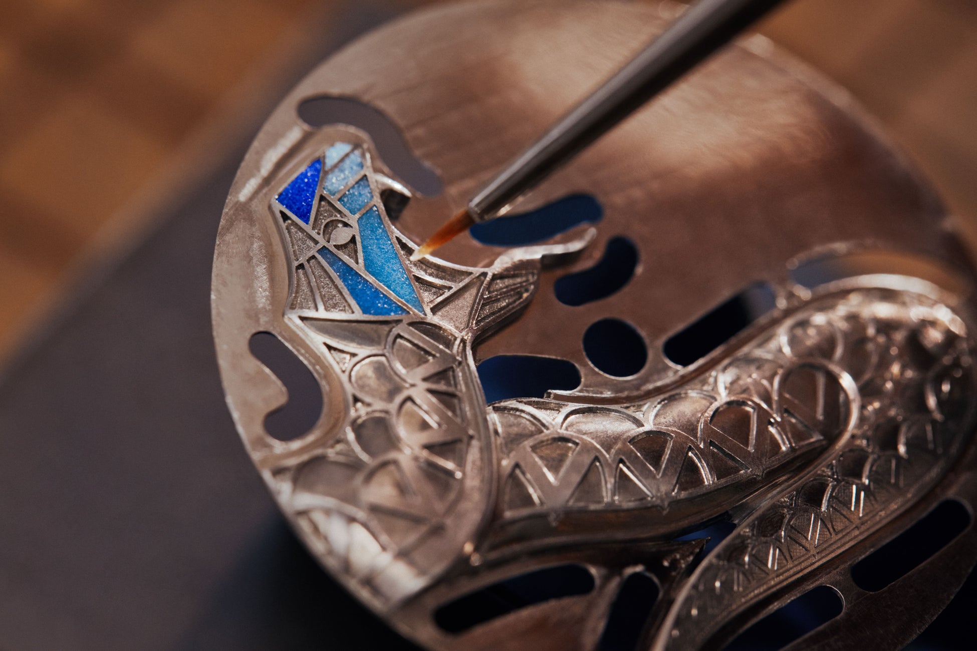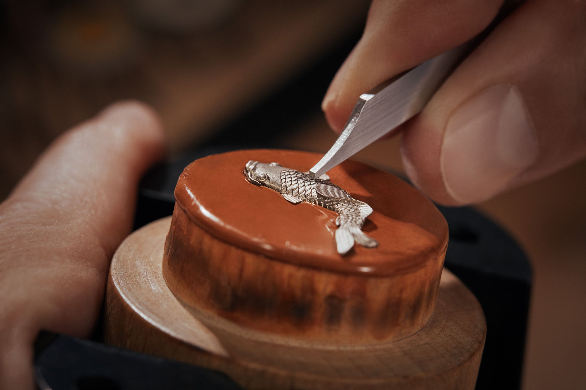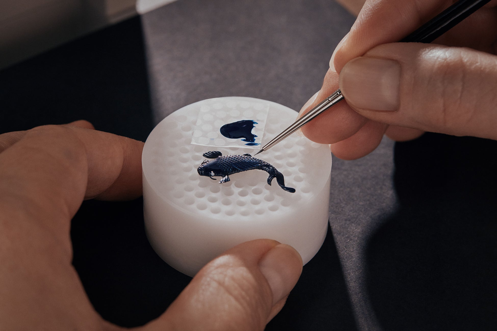 次の工程では、彫刻職人が手作業で磨き上げながら、熟練の目で1つ1つのピースを見極めます。酸化膜を選択的に取除くことで、鯉のウロコのしなやかな虹色の光沢と呼応するように、下地のホワイトゴールドが透けて見えてきます。最後の仕上げとして、細密画家が鯉に半透明のブルーの漆を塗ります。この最後の重要な工程こそが鯉に命を吹き込み、光差す庭池にいる本物の日本の鯉のように輝かせます。
