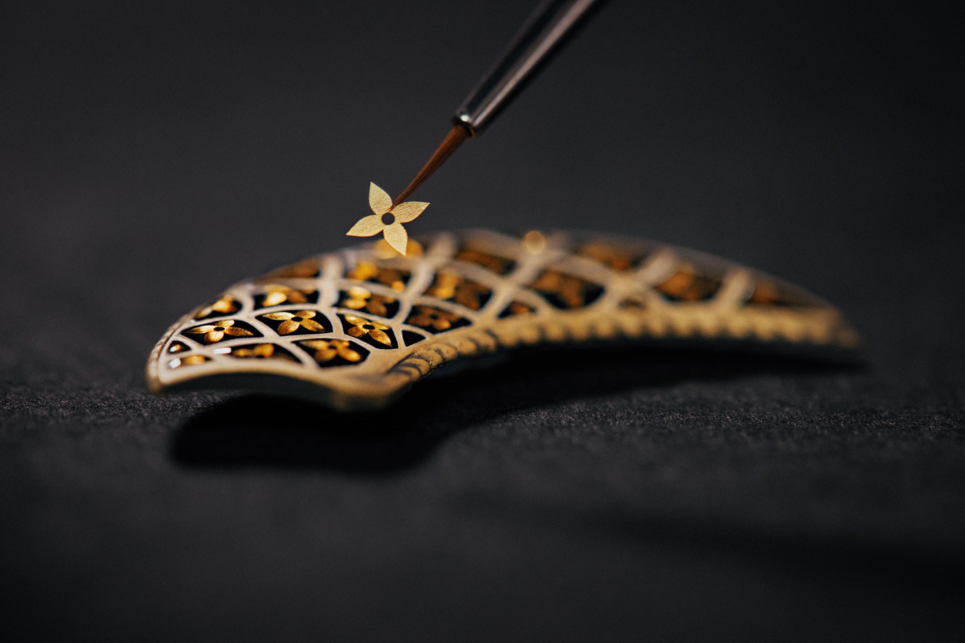 アジアの龍の伝統的な生息地を表現するために選ばれたのは、ダマシン技法と呼ばれる珍しいテクニック。ダマシン技法は、対照的な色のメタルを用いた装飾的な象嵌細工の一種で、自然界に見られる有機的な質感を反映したレイヤー状の外観を生み出します。「ルイ・ヴィトン エスカル キャビネット オブ ワンダーズ ドラゴンズ クラウド」では、文字盤をハンマーで叩いてマットな質感に仕上げた後、長さの異なるイエローゴールドまたはローズゴールドのワイヤーを通す溝を作ります。ワイヤーは冷間加工でダイアルプレートに埋め込まれ、その後たがねを使用し、象嵌された金属の形をさらに手作業で整えて仕上げます。龍(そしてそれを取巻く雲)はエングレービングされ、この伝説上の生き物のディテールを引き出すために、ポリッシュとマットな表面で仕上げられています。ウロコにはエナメル加工が施され、下半身にはパイヨンエナメルが使われているのが特徴。2層のエナメルの間に金属箔(パイヨンとして知られる)を挟み込むことで透明感のある光沢が生み出されるパイヨン装飾は、ウォッチメイキングにおける最も繊細な装飾技法の1つとされています。龍のウロコを飾るイエローゴールドのモノグラム・フラワーのパイヨンがブラックエナメルの背景に輝き、より大きなローズゴールドのモノグラム・フラワーが文字盤に華やかに咲き誇ります。