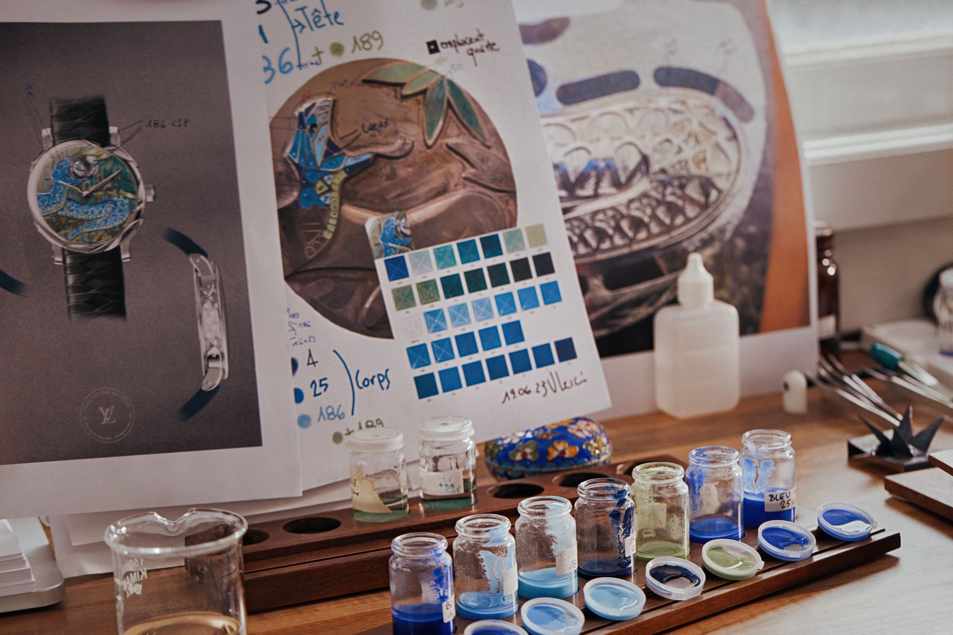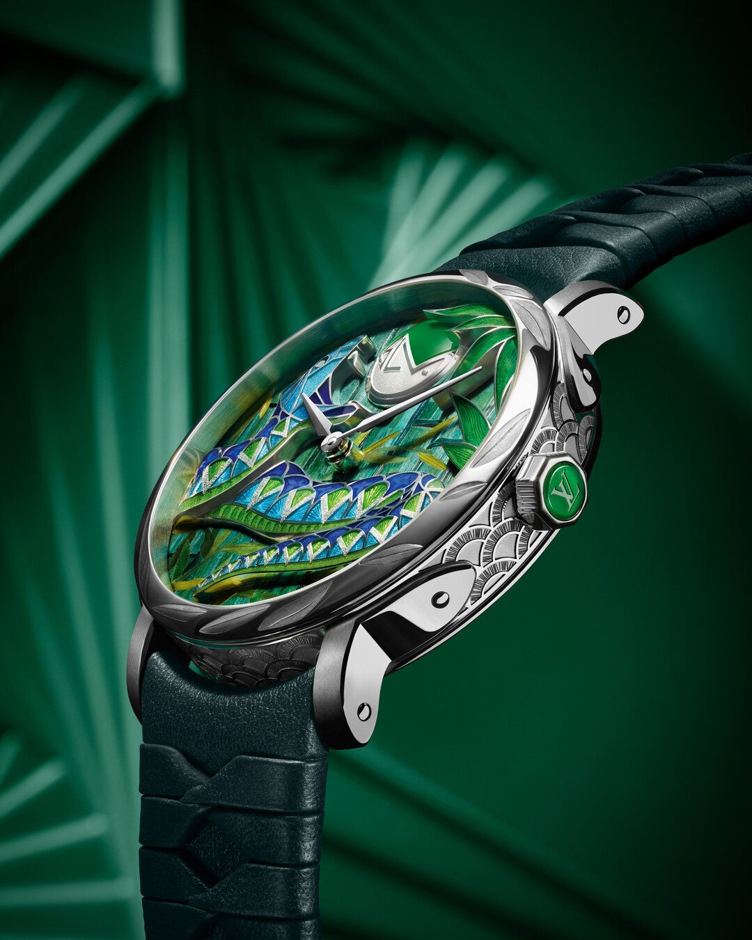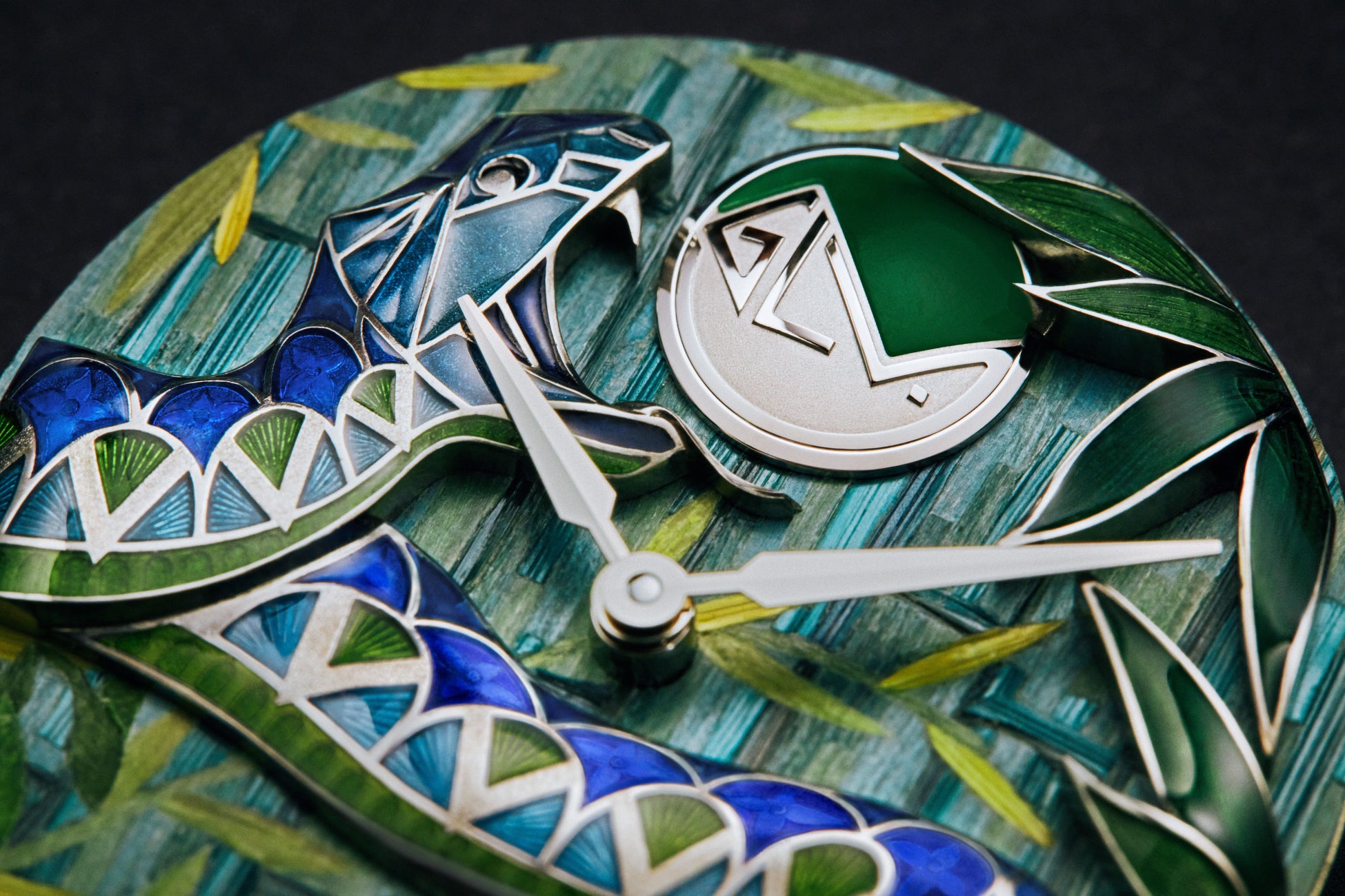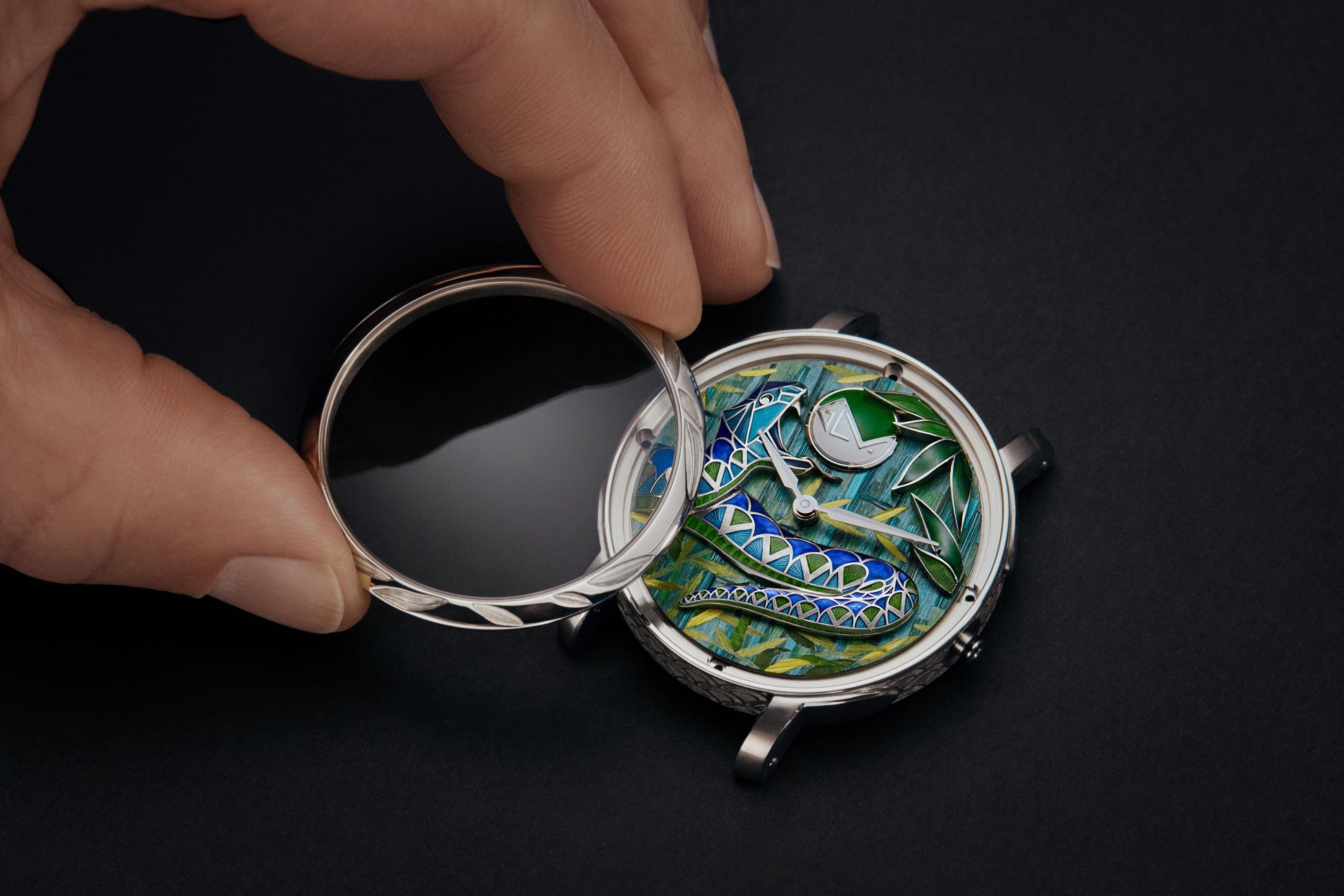 ヘビの製作には、マイクロ彫刻やエングレービング、そしてシャンルベエナメルの3つの非常に難しい技法を組み合わせています。立体的な奥行きと、今にも動き出しそうな印象を与えるためにとぐろを巻くホワイトゴールドのボディは、遠近法の規則に従って彫刻されたもの。ウロコはくり抜かれ、エングレービングによるV字とモノグラム・フラワーで装飾。彫刻とエングレービングの両工程は、シャンルベ様式のエナメルを塗布するために表面が最適になるよう、ホワイトゴールドを削る量を厳しく制限しながら進められました。同じく彫刻やエングレービング、そしてエナメル加工が施された竹の葉が文字盤の右上を縁取り、竹林がGLVモノグラムを包み込みます。