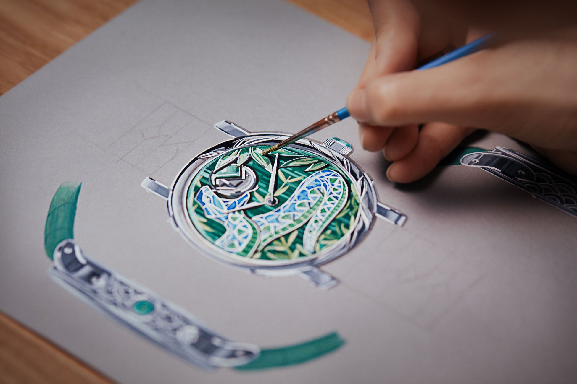 このシーンの生命力は、文字盤だけでは収まりません。竹の葉がガラスの枠からはみ出し、ホワイトゴールドのケースにこぼれ落ちる様子は、手付かずの自然の力強い寓意です。