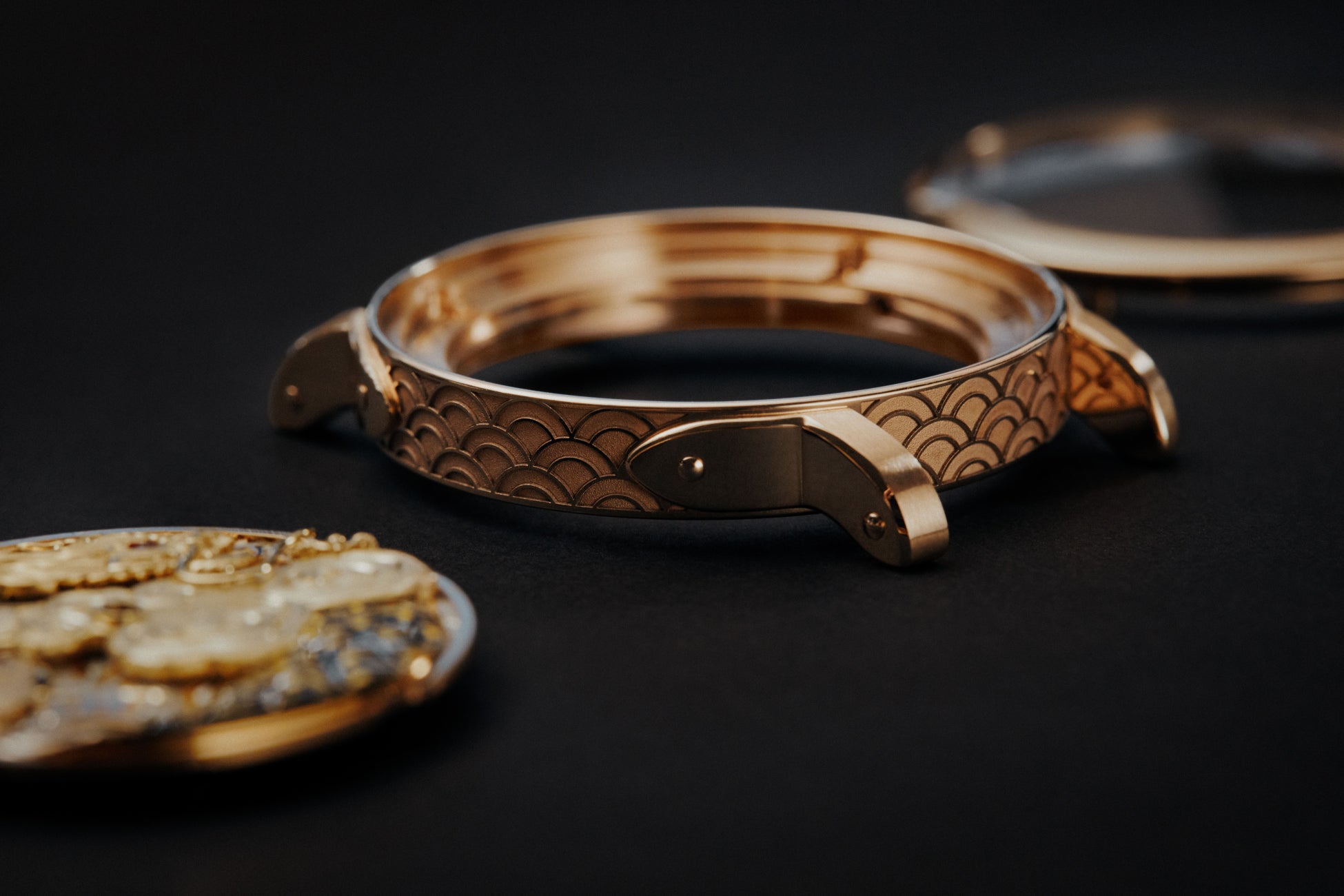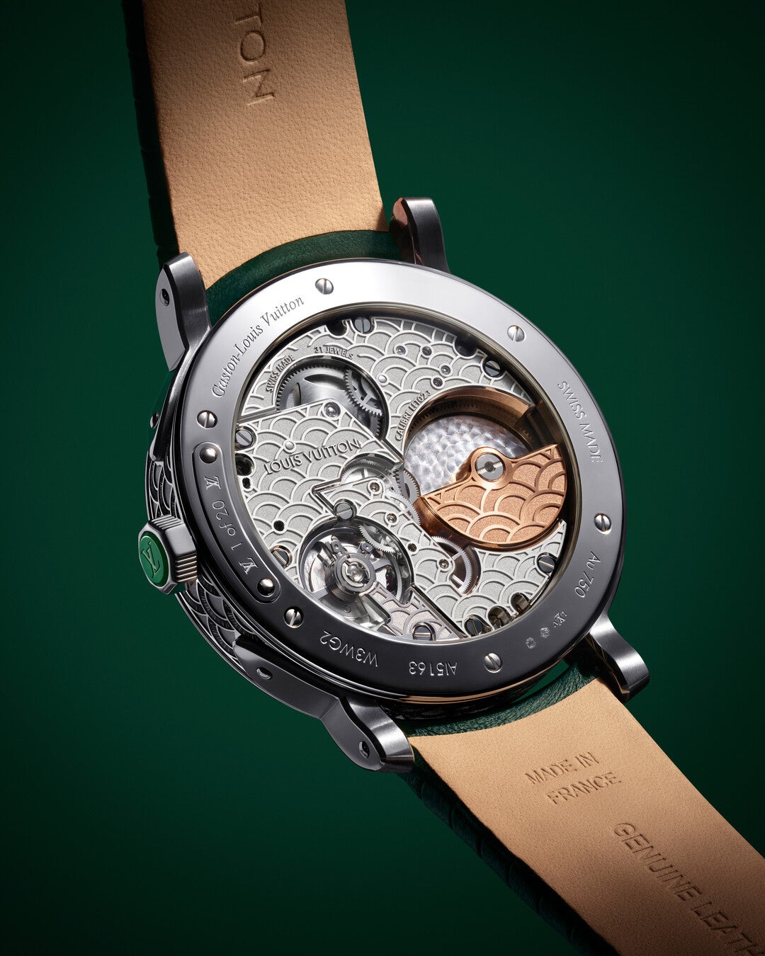 旅の真髄(こころ)は、「エスカル」にも宿り続けています。「キャビネット オブ ワンダーズ」コレクションのケースミドルやバックルに施されているのは、日本の伝統的な図像に見られる大海原が続く様子を模様にした「青海波(せいがいは)」の3種類の装飾。また、ムーブメント(クロノメーター検定機関による認定を受けたマニュファクチュール キャリバーLFT023)のブリッジにも、未来永劫平穏にという願いが込められたお守りのモチーフがあしらわれています。
