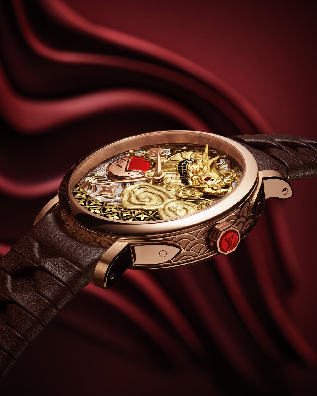 粋を極めたアルチザンの技が光る3部作の最後を飾るのは、カーネリアンをセットしたGLVモノグラムを抱く雄大な龍を描いたローズゴールドのモデル。アジアの龍は西洋の龍とは異なって空と水の生き物であり、多くの場合、湖の近くや雲に絡まった姿で描かれています。