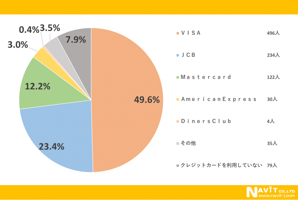 メインで使用しているクレジットカードでいちばん多かったのは「VISA」で49.6%と約半数を占めています。次が国産ブランドの「JCB」で23.4%、3番目が「Mastercard」で12.2%となっています。