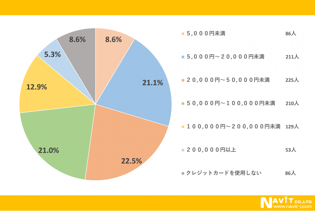 クレジットカードは便利ですが、使いすぎに注意が必要です。クレジットカードの支払い額が「20,000円〜50,000円未満」という方が1番多く22.5%となっています。次が「5,000円〜20,000円未満」で21.1%、3番目に多かったのが「50,000円〜100,000円未満」で21.0%となっています。