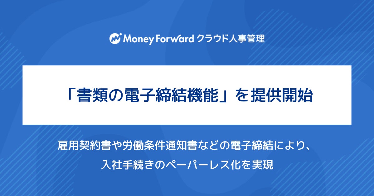 株式会社マネーフォワードは、『マネーフォワード クラウド人事管理』において、「書類の電子締結機能」を提供開始しました。これにより、『マネーフォワード クラウド人事管理』上で作成した雇用契約書や労働条件通知書などの書類を従業員に送信し、電子締結や電子署名の付与ができるようになります。