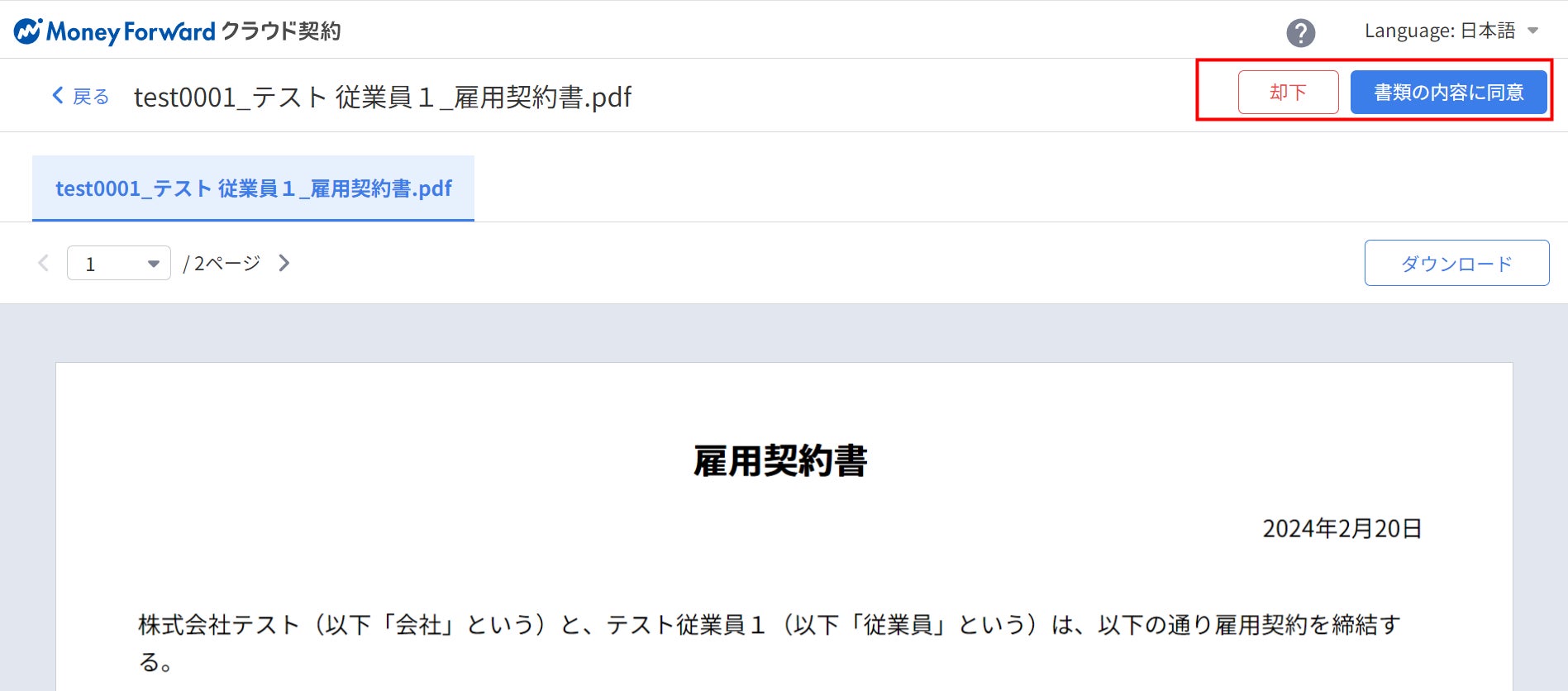 書類をメールで受信した従業員は、メールに記載のURLをクリックすることで、『マネーフォワード クラウド契約』※ の画面で書類の「同意」や「却下」が可能です。