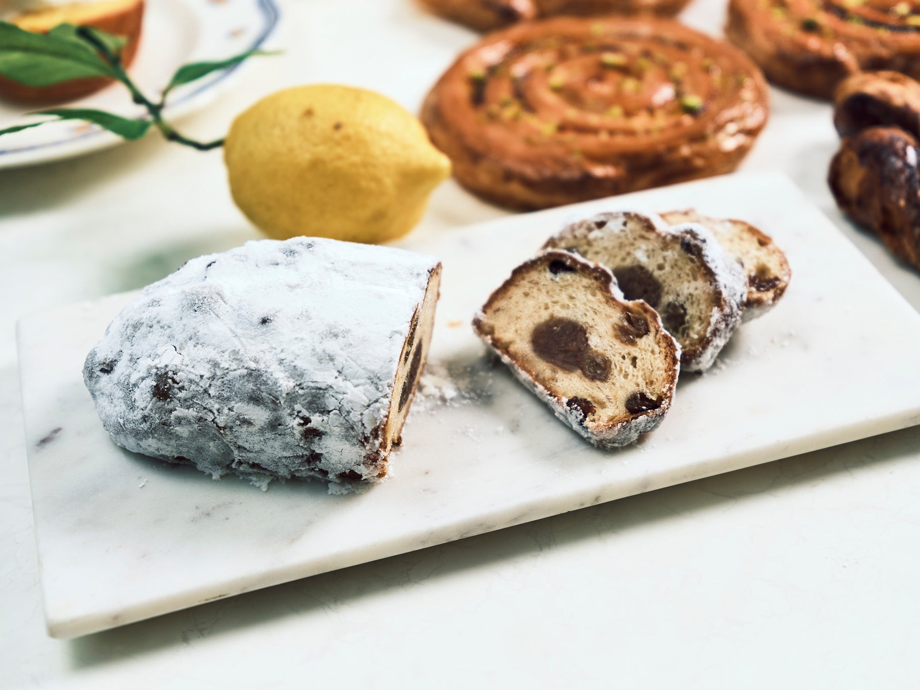 ドイツの伝統的な発酵菓子にレモンとレーズンを入れました。冷やして薄くスライスしてお召し上がり下さい。