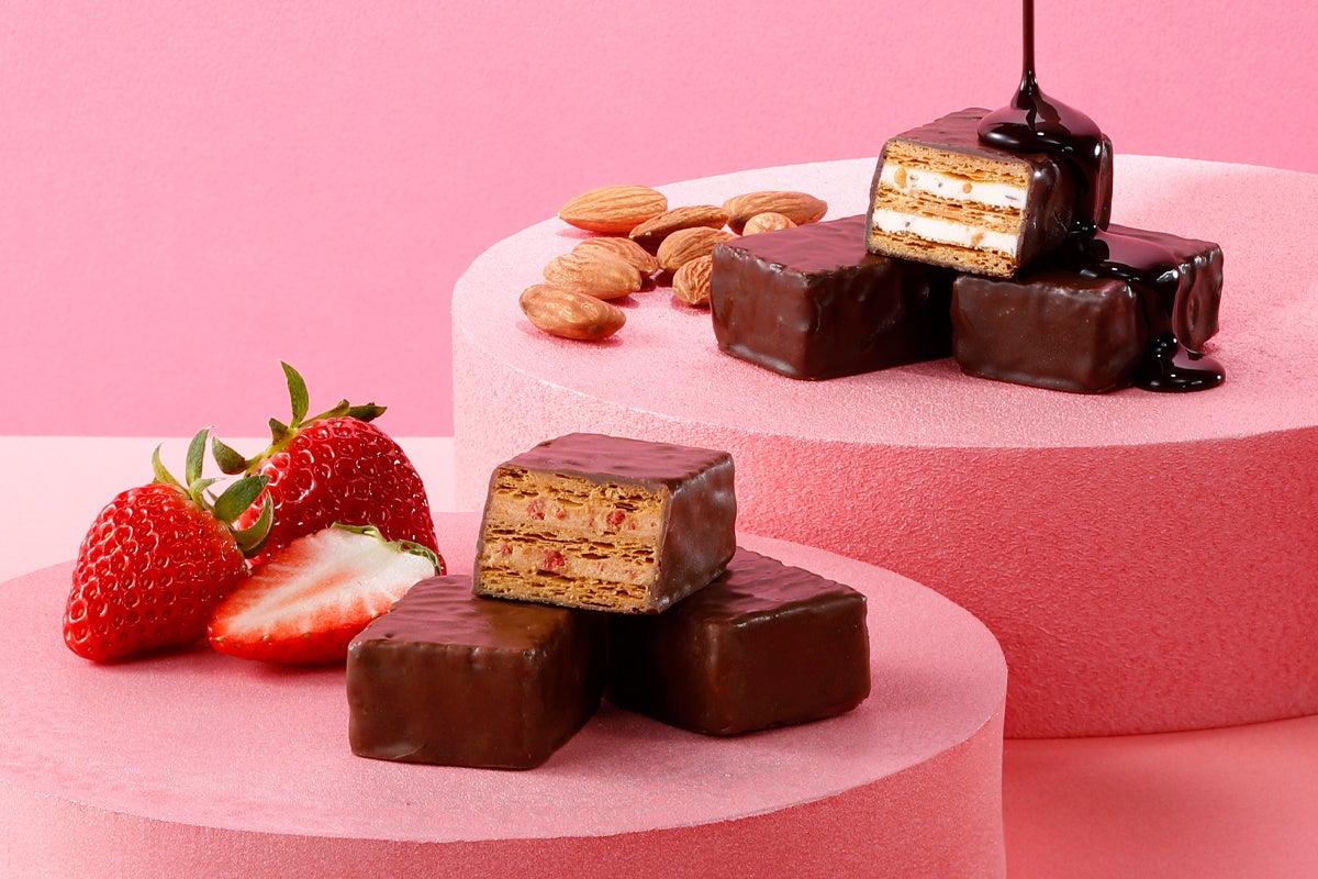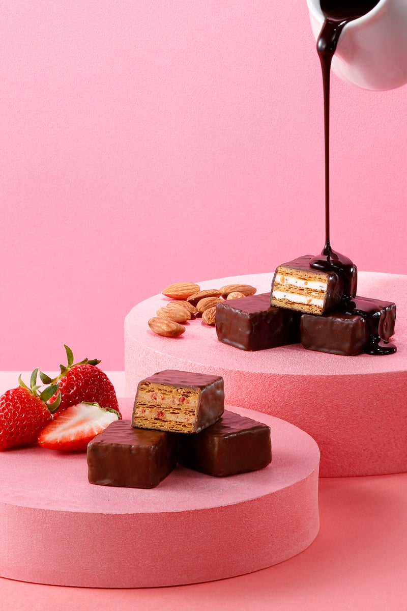 「キャラメル苺」は、ビターキャラメルクリームをパイ生地でサンドし、食感が楽しい苺クランチを加えました。ほんのりとした塩味はキャラメルの甘みを引き立てます。苺クランチの酸味も合わさって、絶妙な味わいをお楽しみいただけます。