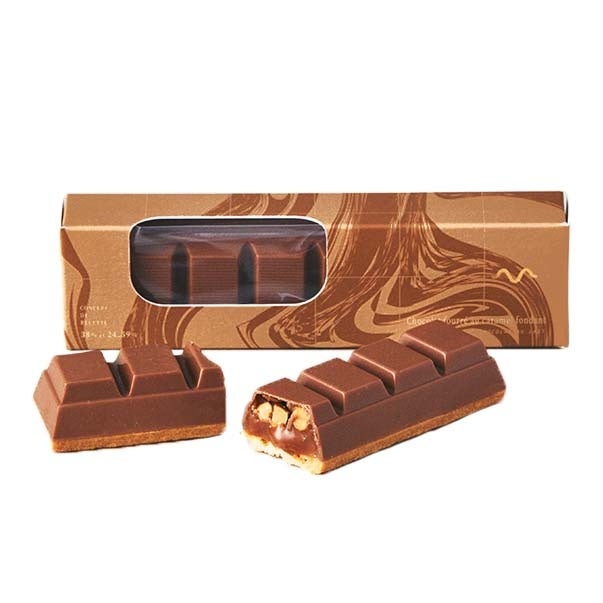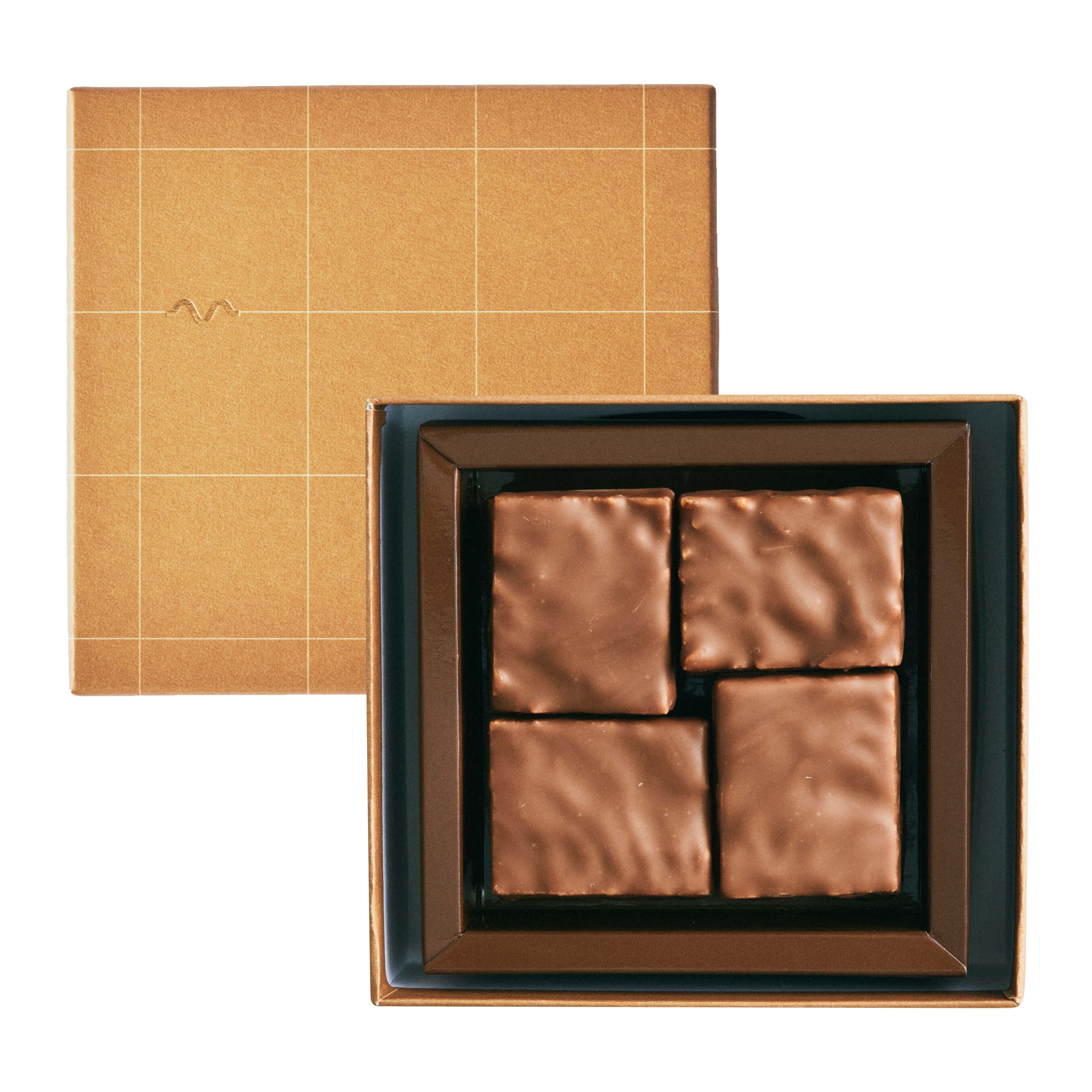 香ばしい食感のキャラメルナッツチョコレート。軽く煮詰めたキャラメルにローストしたアーモンドやくるみを加えてカリっと食感のヌガーに仕上げ、ミルクチョコレートをコーティングしました。一度食べるとクセになる魅惑のおいしさです。