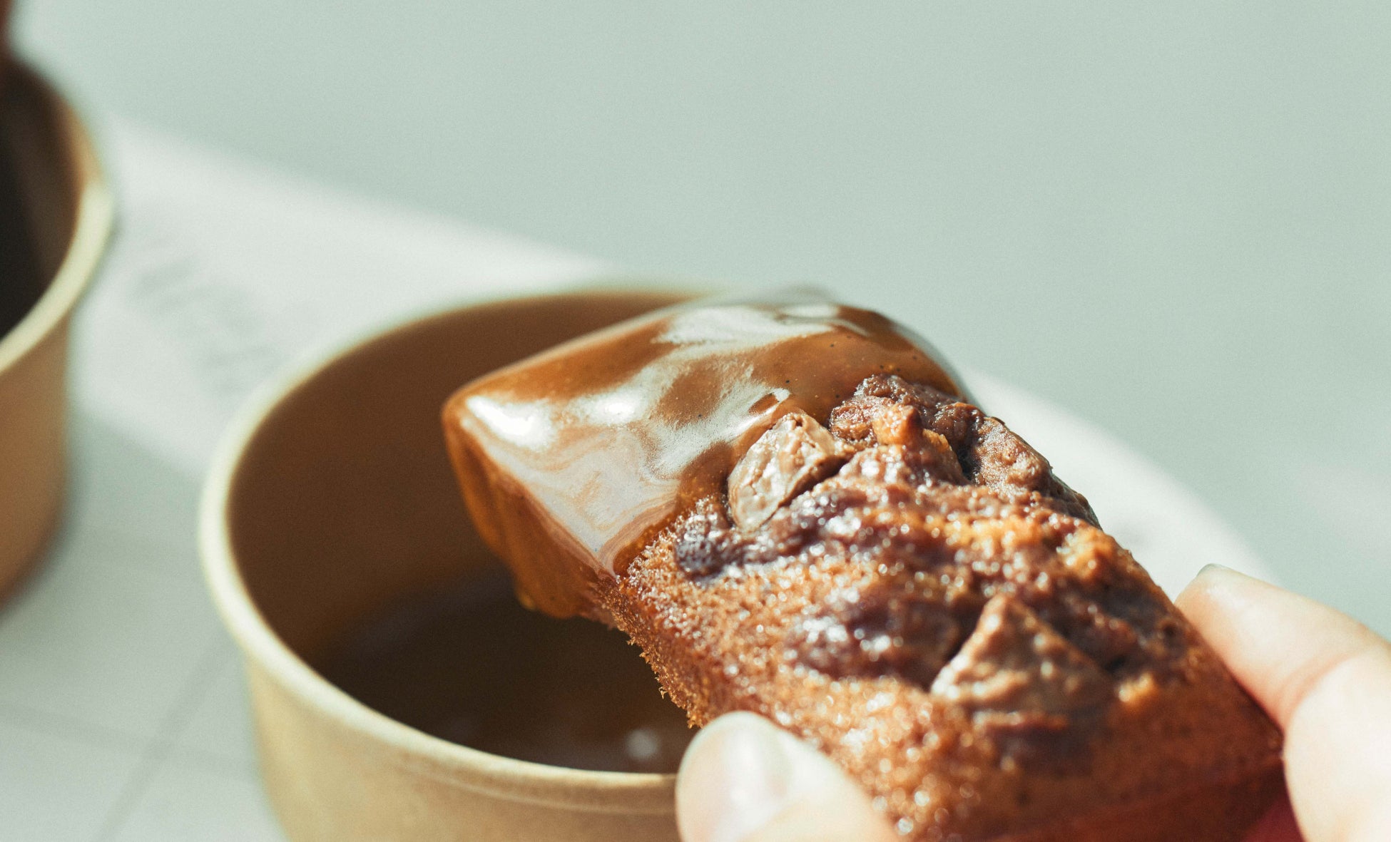「焼きたてショコラフィナンシェ・ミュリル」3個と、愛媛県産岩城レモンとキャラメルを合わせたディップソースをセットでご用意いたします。とろりととろける温かいソースに、焼きたてフィナンシェをディップ。濃厚でありながらもレモンの爽やかな酸味を感じられるソースが、ミルクチョコレートの甘みとミルキーな香りに絡み合い、鼻に抜ける余韻までご堪能いただけます。