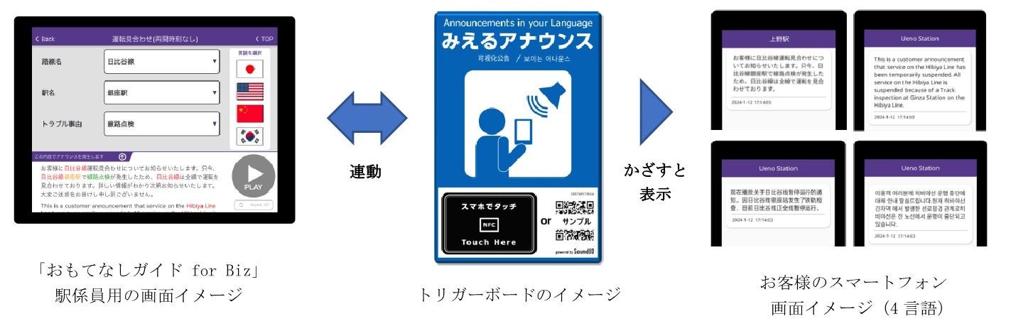 本サービスは、駅係員が操作して4言語(日・英・中・韓)のアナウンスを放送できるタブレット/ス