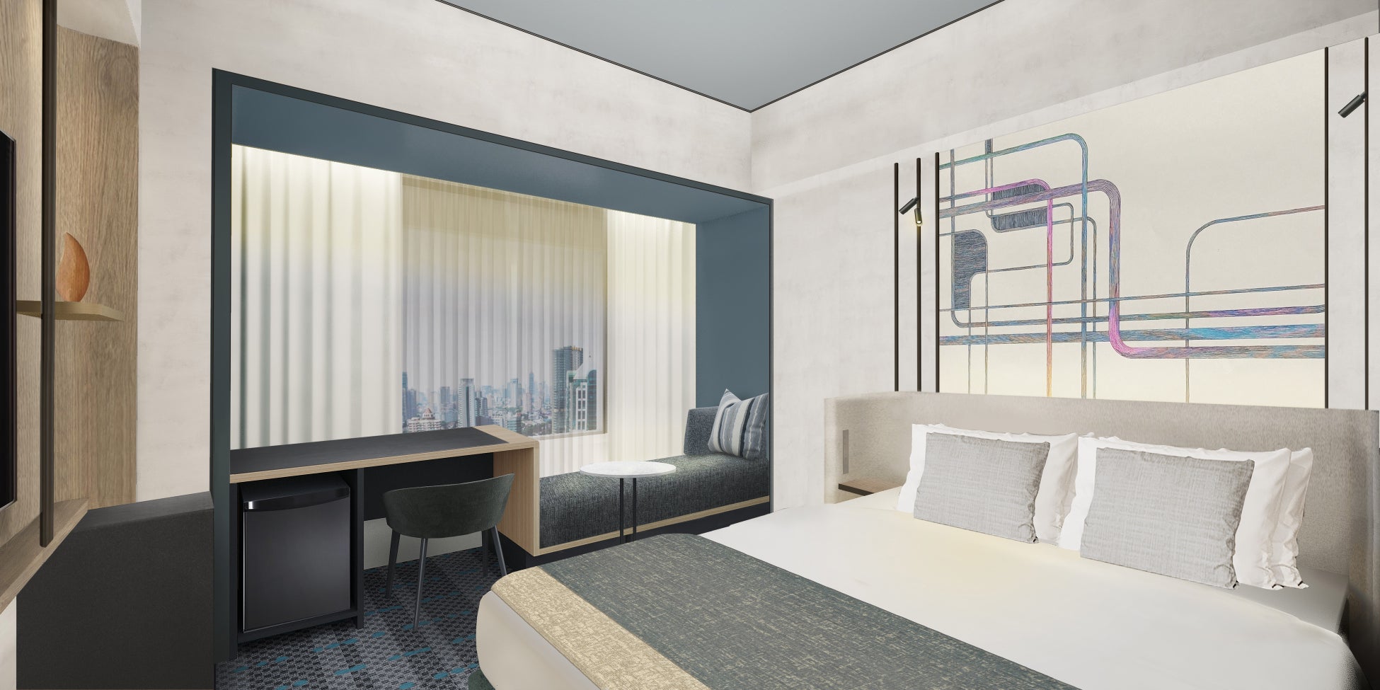 街と地域との深い結びつきを「辻」というテーマで表現。8路線が交わる池袋は、多様な文化が巡り、出会い、 交差する活気溢れる街。そんな池袋の特徴を生かし描かれた「コンセプトアート」を各部屋に装飾。