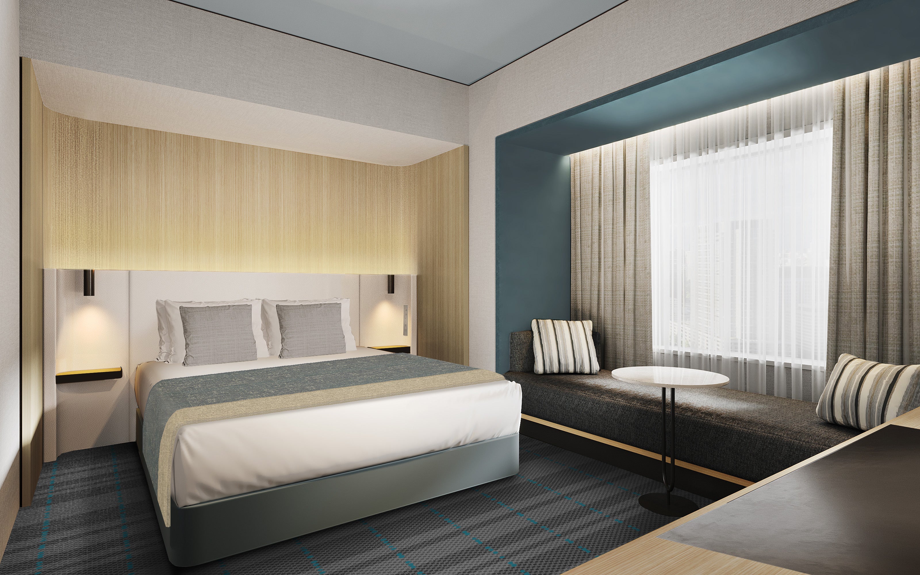 ホテルシンボルカラー「ジェイドブルー」を通して躍動 する池袋の街を感じていただけるよう設計いたしました。