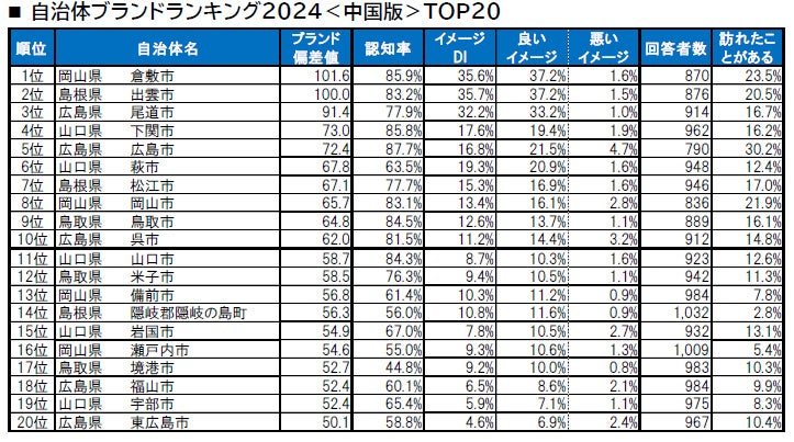 いい部屋ネット「自治体ブランドランキング2024<中国版>」(街の住みここちランキング特別集計)発表