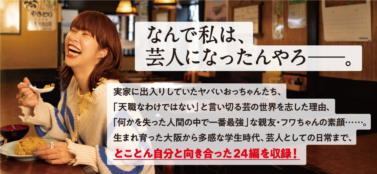 実家に出入りしていたヤバいおっちゃんたち、突然姿を消した憧れの同級生の行方、「天職なわけではない」と言い切る芸の世界を志した理由、「何かを失った人間の中で一番最強」な親友・フワちゃんの素顔……。生まれ育った大阪から多感な学生時代、芸人としての日常まで、懐かしくて恥ずかしくて、誇らしくて少し切ない24編を収録。