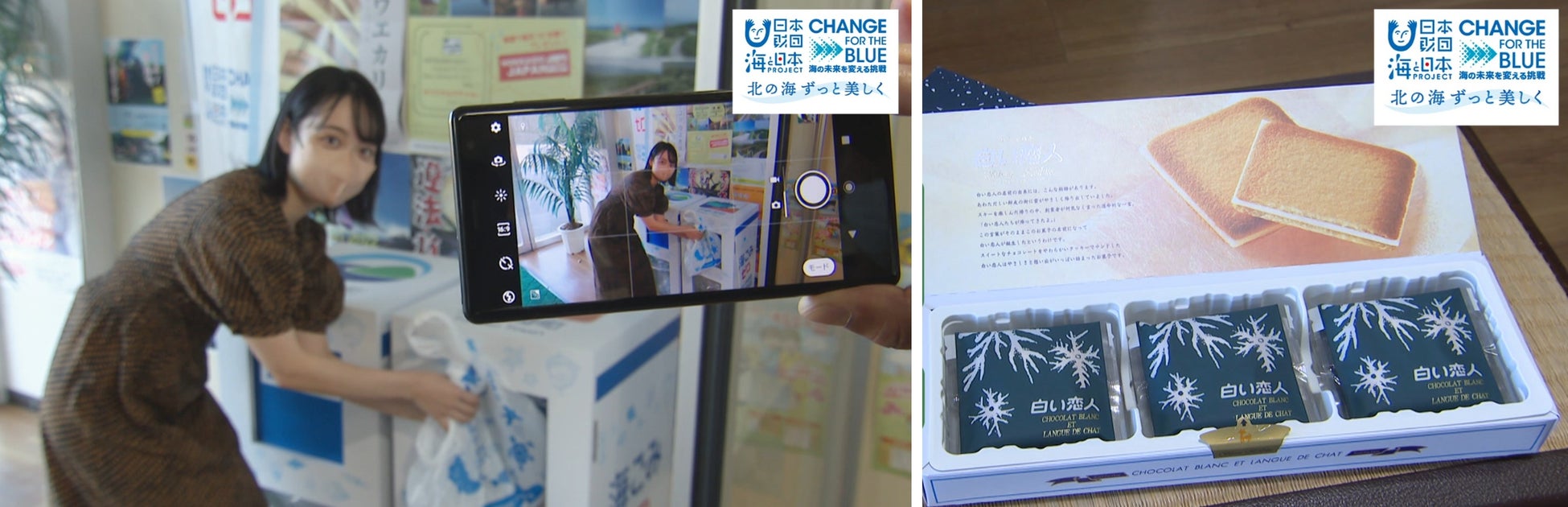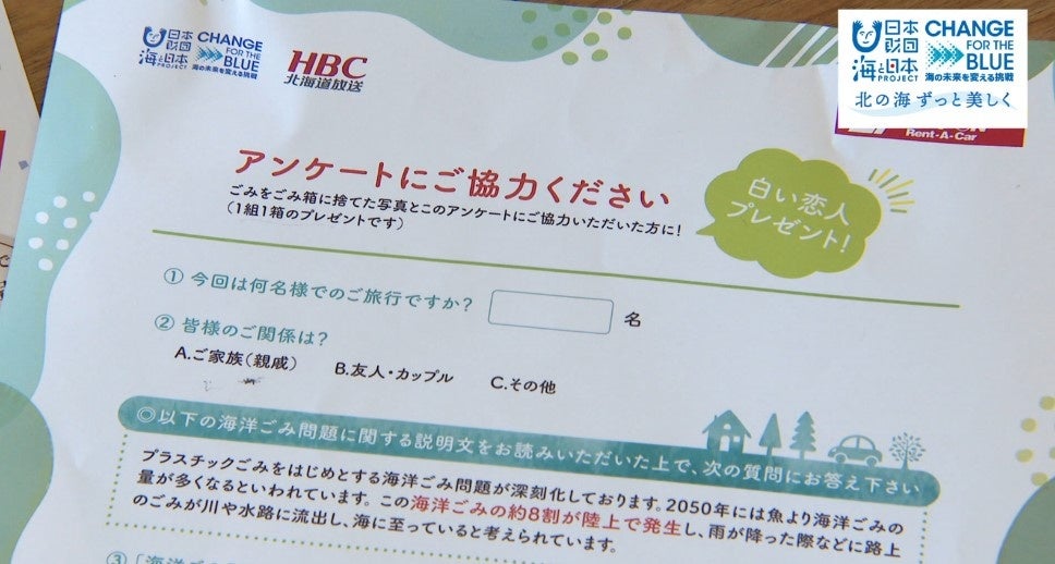 車を借りる際に「CHANGE FOR THE BLUEごみ袋」と「趣旨説明のチラシ」「海洋ごみに関するアンケート」を渡し、旅行中に出たごみは、ごみ箱にきちんと捨てる事とその様子を写真に撮る事を依頼。車の返却時にその写真を受付に見せ、海洋ごみアンケートに答えると、北海道みやげとして長年絶大な人気を誇る「白い恋人」をプレゼントいたしました。