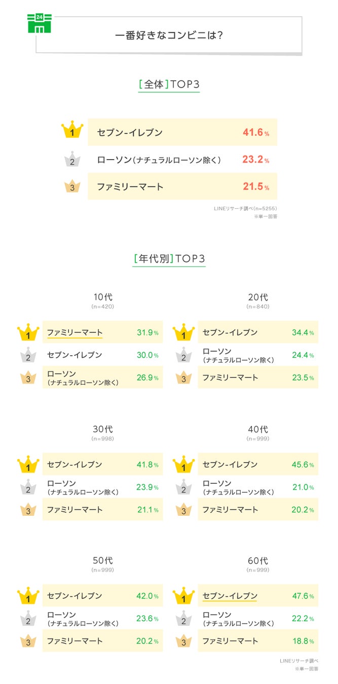 【LINEリサーチ】一番好きなコンビニ、全体では「セブン-イレブン」が1位で4割強、10代では「ファミリーマート」が僅差で1位に