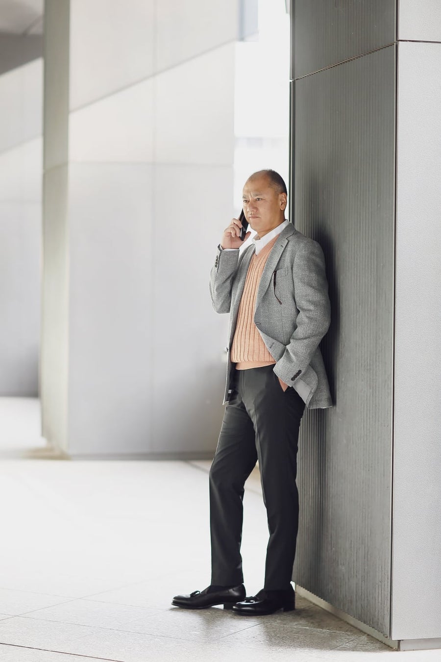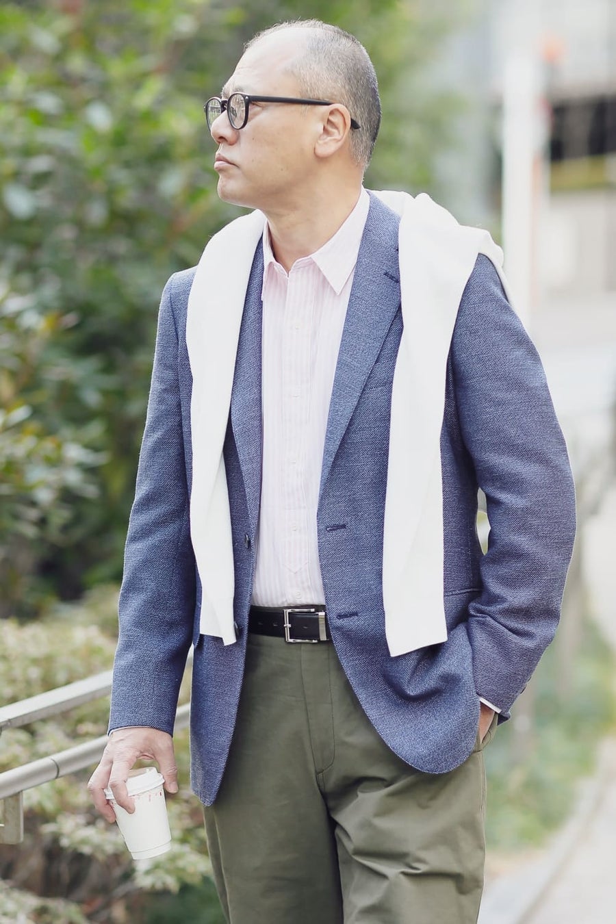 休日のジャケットスタイルは、カーゴパンツとスニーカーを合わせてラフさを演出。カラーアイテムが苦手な方でも取り入れやすく、遊び心を感じさせるピンクのストライプシャツがポイント。ニットを肩掛けすることで粋なトラッドスタイルの完成です。
