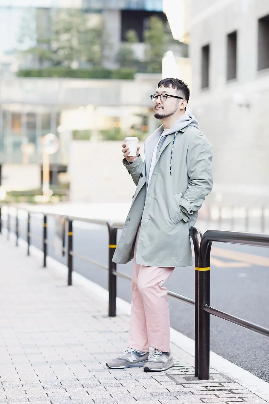 カーキ×ピンクのカラーコーディネートで春の訪れを楽しむ、休日のふらっと散歩コーディネート。パンツの色をいかすよう、パーカとシューズは柔らかい印象のグレーをチョイス。時間に余裕のある日は少し遠くまで歩きたくなる、そんな軽快さを感じるスタイリングです。