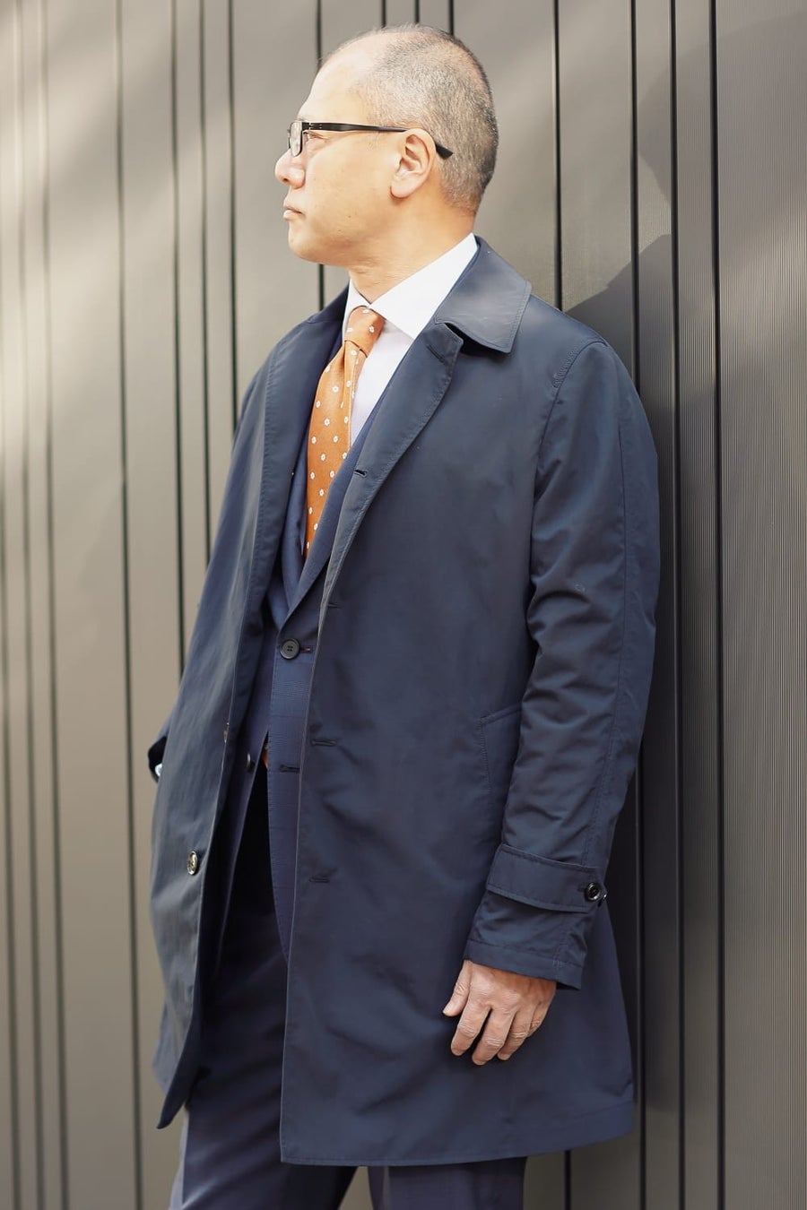 肌寒さの残る日に外回りへ出るビジネススタイル。コートとスーツは落ち着きと余裕を感じさせるネイビーカラーをチョイスし、取引先に明るい印象を与える春カラーのネクタイをコーディネート。フラワーモチーフでさらに柔らかい雰囲気に。