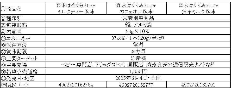 このたび新発売する「森永はぐくみカフェ」シリーズは、当社の育児用ミルクブランド「森永はぐくみ」シリーズが新しく展開する、妊娠期・授乳期に必要な栄養をバランスよく配合したミルク感たっぷりの粉末飲料です。カフェインゼロなので妊娠期・授乳期のママも安心してお召し上がりいただけます。また15種類のビタミン・ミネラルに加え、食物繊維、オリゴ糖を配合しています。さらに持ち運びにも便利なスティックタイプで、お湯か水に溶かすだけで簡単に作れます。
