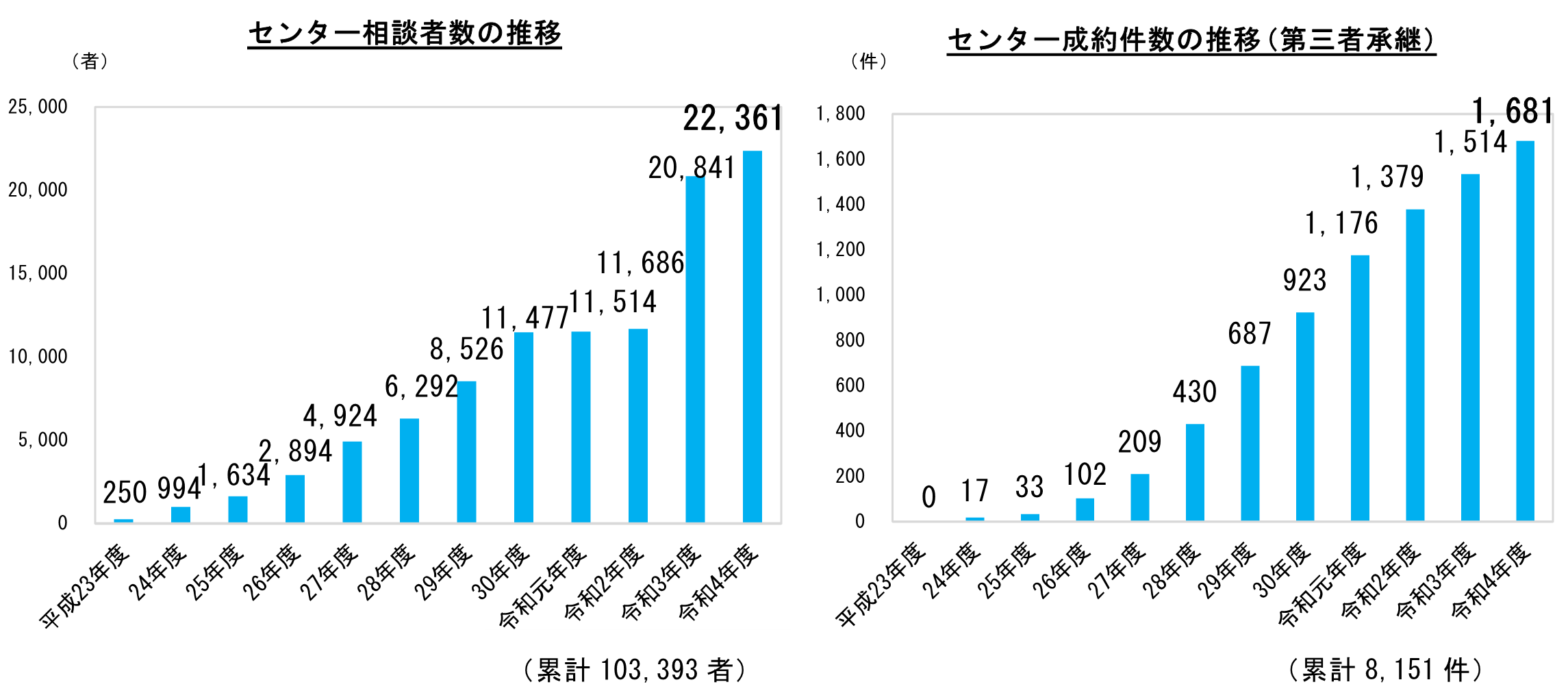 令和4年度は、コロナ禍に加え、エネルギー高、原材料費の高騰など、経済環境の大きな変化の中でも事業承継の支援ニーズは大きく、事業承継に関するセンターへの相談者数は、22,361者(前年度比107%)と過去最高となりました。また、第三者承継(M&A)の成約件数についても、1,681件(前年度比111%)と、同じく過去最高を記録しました。その結果、平成23年度のセンター開設以来の累計は、相談者数が103,393者、事業引継ぎ成約件数は、8,151件となりました(資料1、2参照)。