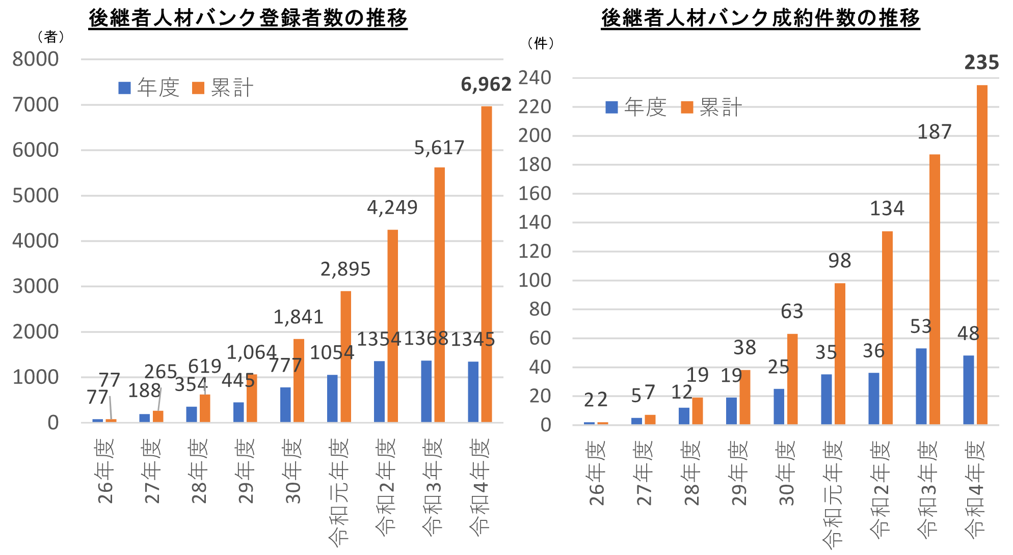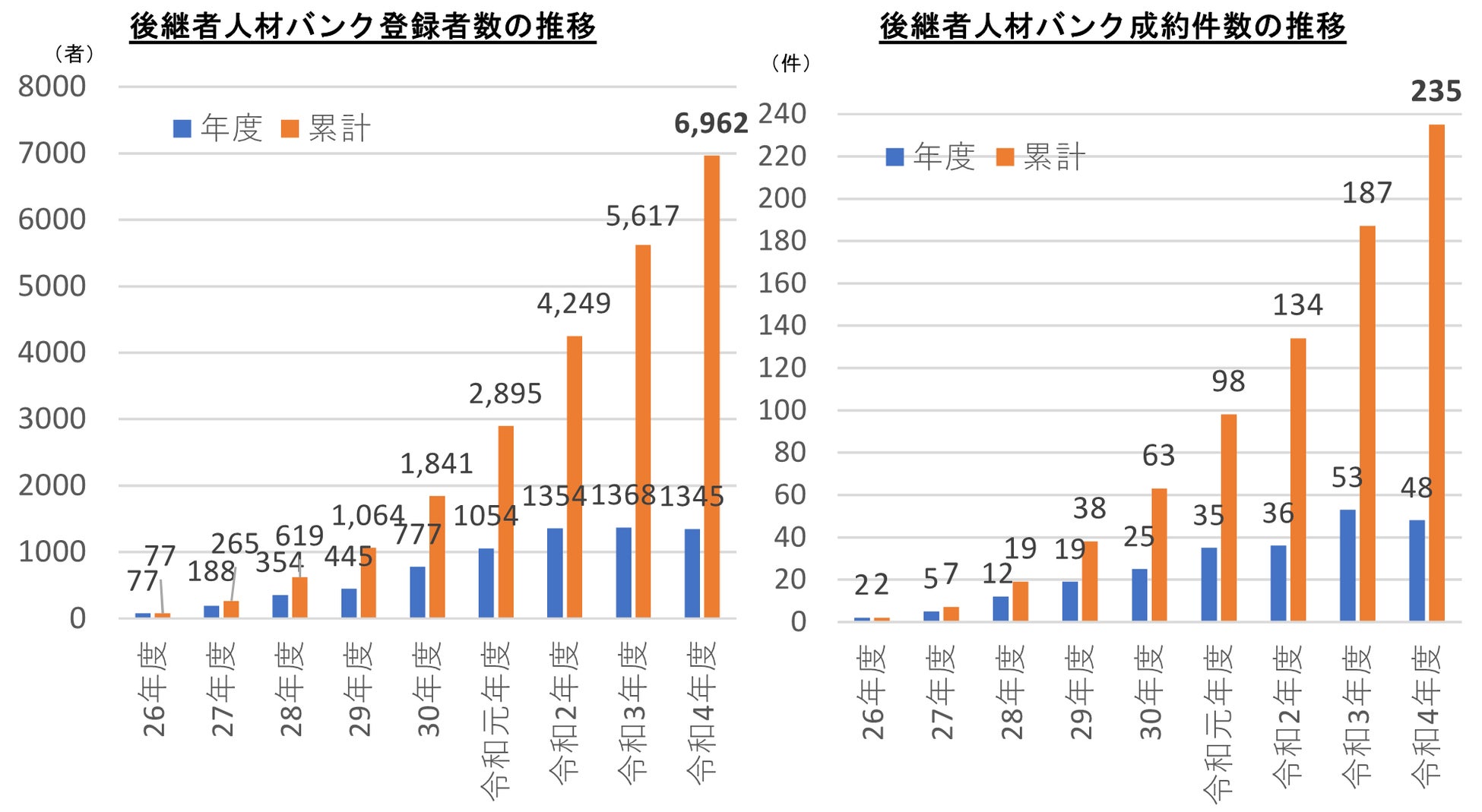 また、創業希望者と後継者がいない中小企業・小規模事業者の事業引継ぎの橋渡しを行う後継者人材バンク事業は、登録者数が1,345者、うち成約まで至ったものが48件と前年度並みの実績となりました。本事業の累計登録者数は、6,000者を超え6,962者となり、うち累計成約件数は235件となっています(資料3参照)。