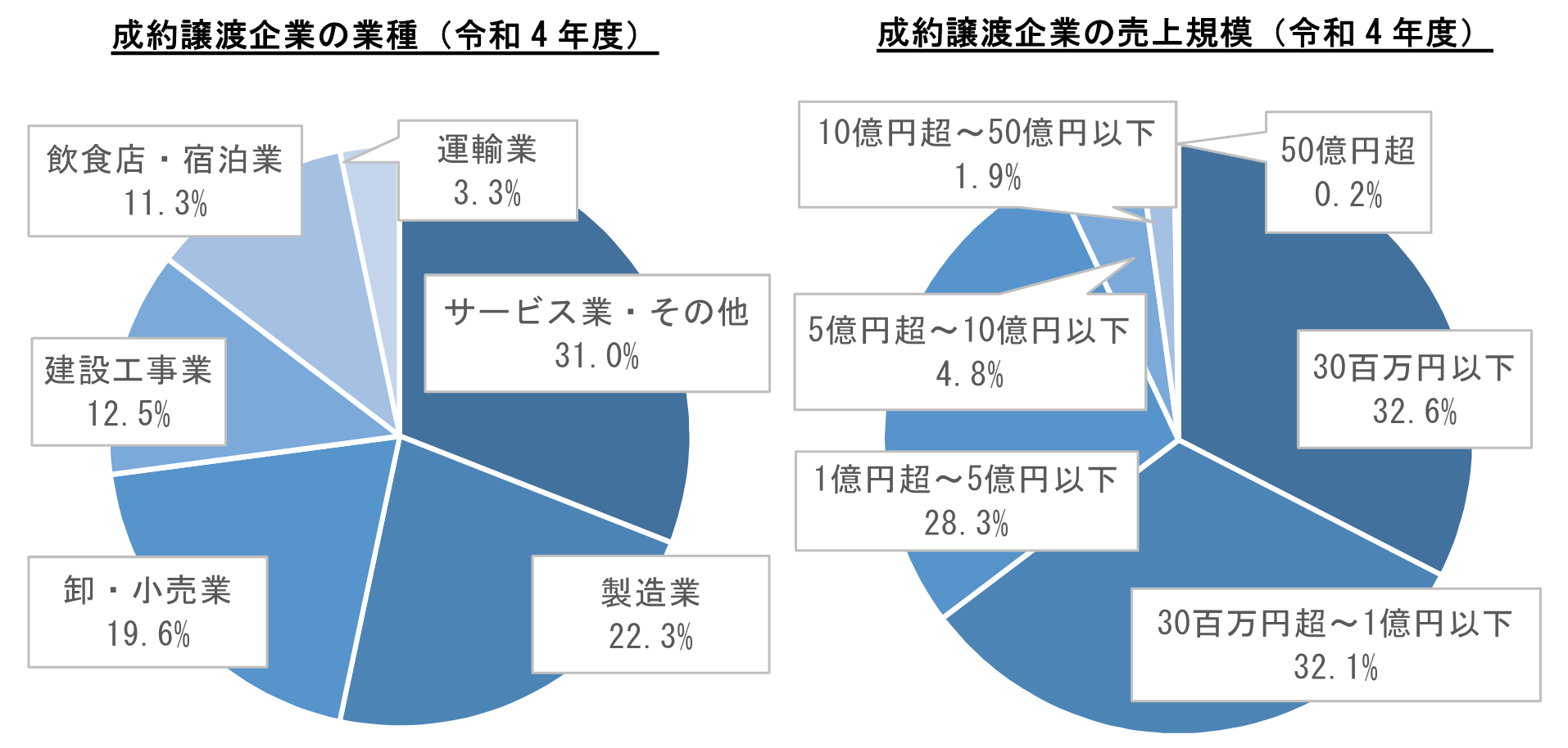 ●<資料2>成約譲渡企業の業種別の割合、売上規模別の割合は以下の通り。業種、売上規模ともに、割合は概ね例年と同様となっている。