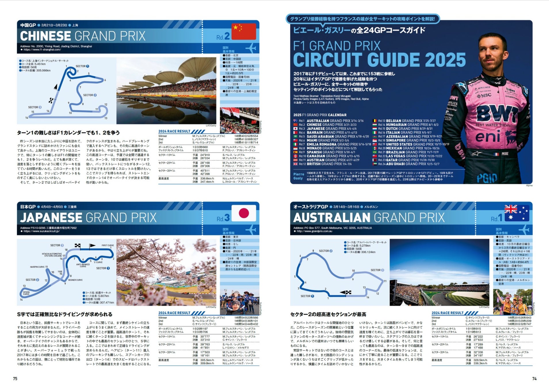 全10チームの10台のニューマシン、ルーキー含めた20人のドライバー、3月開催の開幕戦オーストラリアGPから12月開催の最終戦アブダビGPまでの全24戦のコース解説、開幕前のF1テストでその姿を表した全チームの2025年版ニューマシンの詳細解説からスタッフ移籍情報までと情報満載!