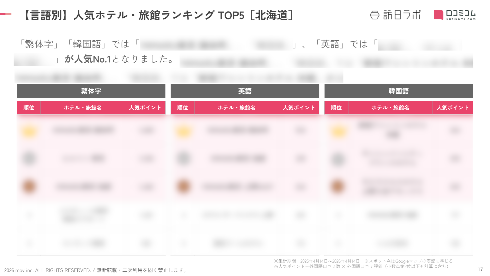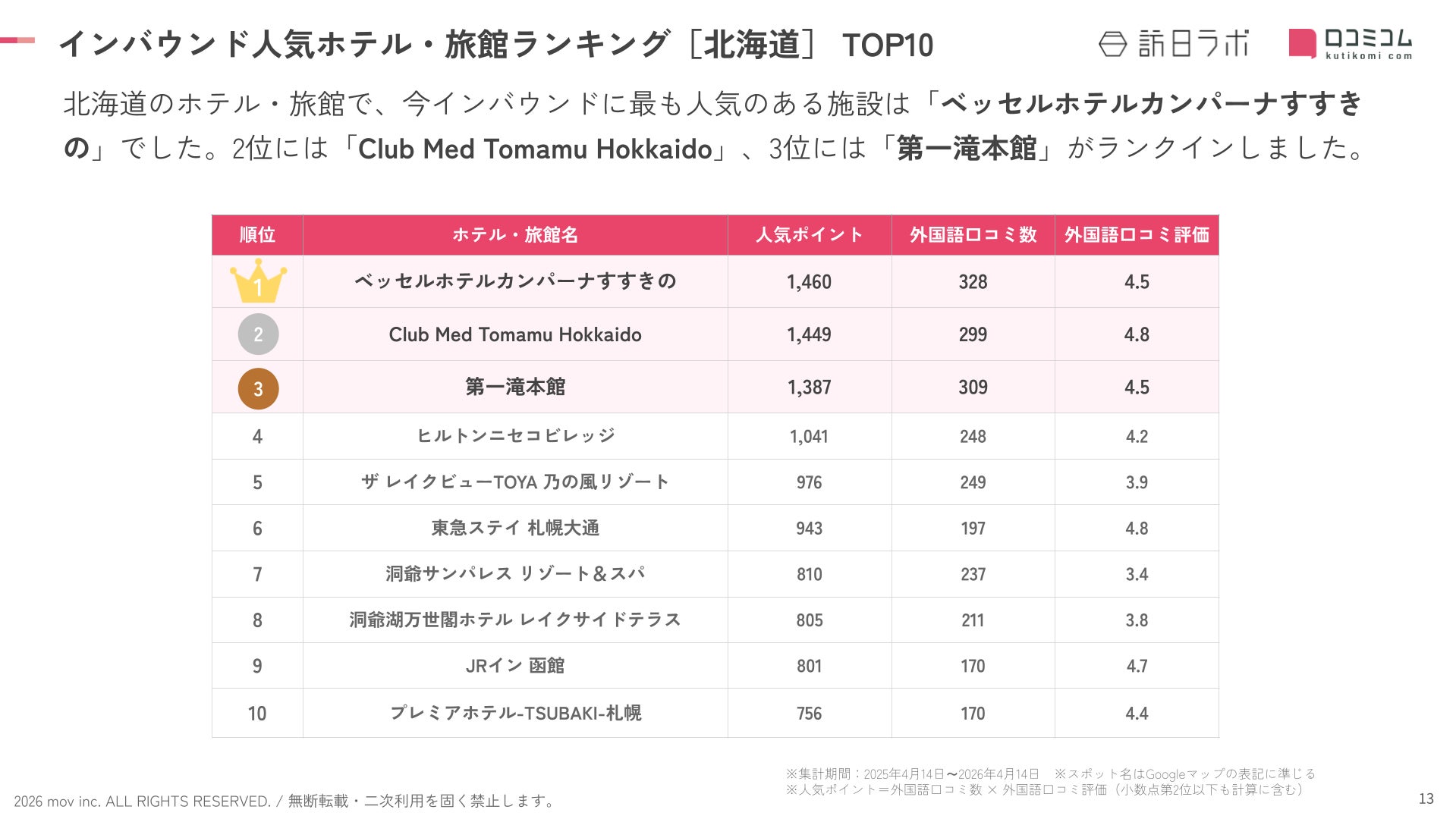 業界最大級のインバウンドビジネスメディア「訪日ラボ」及び 店舗向け集客一元化プラットフォーム「口コミコム」を運営する株式会社mov(代表取締役:渡邊 誠、本社:東京都渋谷区、以下mov)は、北海道のホテル・旅館に寄せられた最新の口コミデータから、独自の『インバウンド人気ホテル・旅館ランキング』を発表しました。