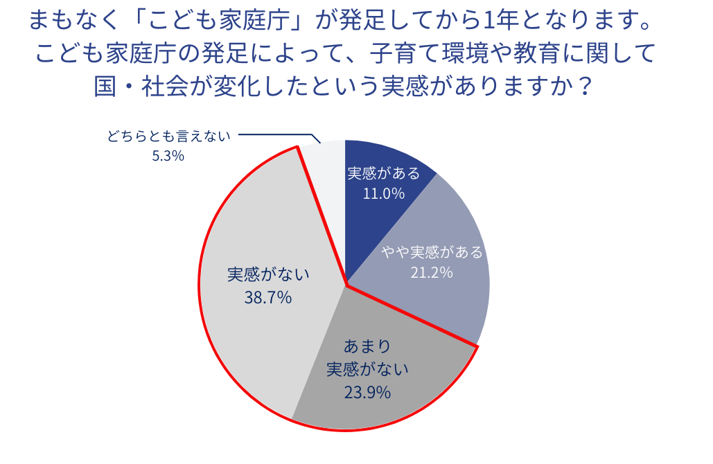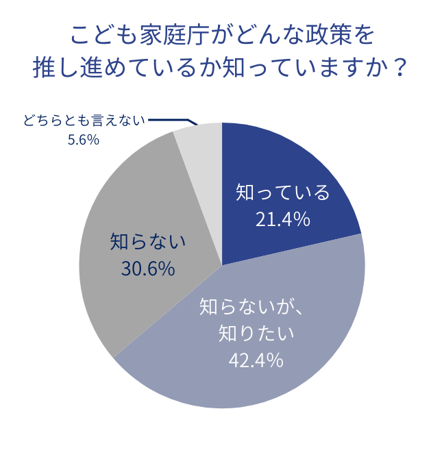 62.6%がこども家庭庁発足後の国や社会に「変化した実感はない」とした一方、同庁への関心は一定程度あり、42.4%は同庁がどんな政策を推し進めているか「知らないが、知りたい」と回答。