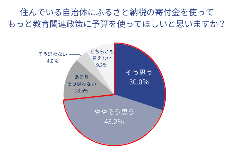 ◆ 53.9%の家庭がふるさと納税制度を利用。一方、自分が住んでいる地域が集めたふるさと納税の寄付金が、どのように行政施策に活用されているのかを知らない人は60.8%。また、住んでいる自治体に対して「ふるさと納税の寄付金を使ってもっと教育関連政策に予算を投じてほしい」と考える人は73.2%に上った。具体的には「子育て関連の施設・設備の充実」に使ってほしいと考える人がここでも最多だった。