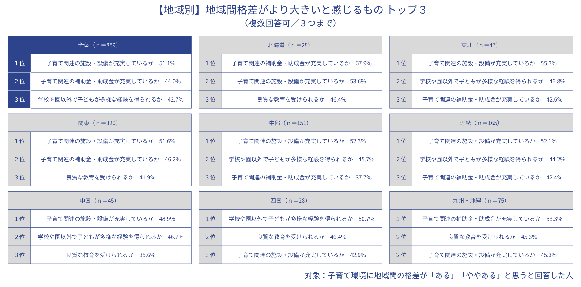 全体的に「子育て関連の施設・設備の充実」に関して地域間格差があると答えた人が多い。一方、エリア別では、北海道、関東、九州・沖縄以外の地域で「学校や園以外で子どもが得られる多様な経験」について格差を感じる人が多かったほか、四国や九州・沖縄では「良質な教育」が受けられるかどうかという点が2番目にランクインしたことも特徴的。