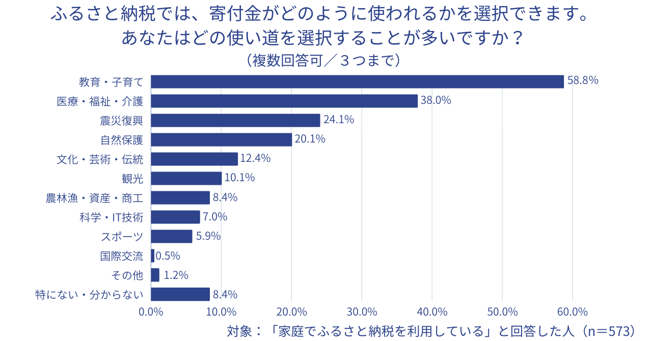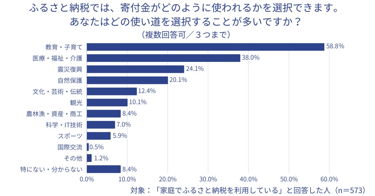 ◆ ふるさと納税をする際に選べる寄付先自治体における寄付金の使い道について、よく選ぶ項目は多い順に「教育・子育て」「医療・福祉・介護」「震災復興」。