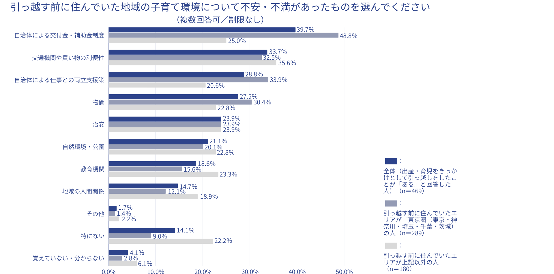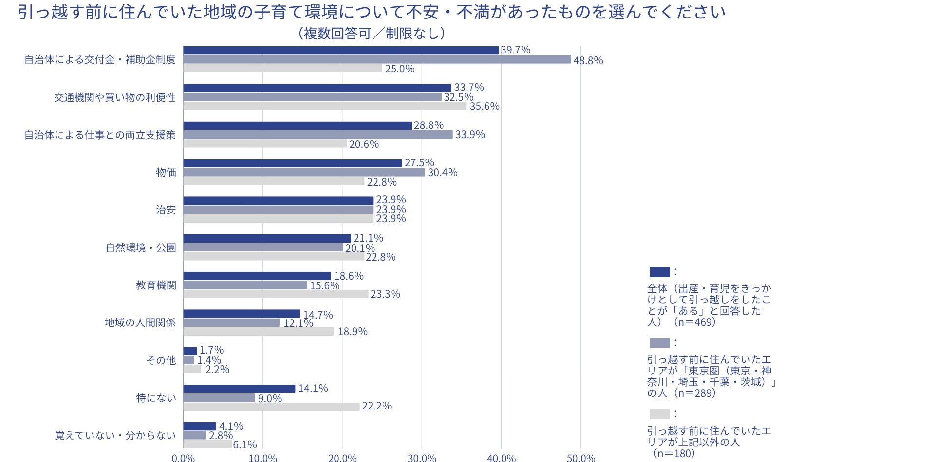 どのエリアから引っ越したケースでも「自治体による交付金・補助金制度」「自治体による仕事との両立支援策」に不安・不満を感じていたとの回答が多く、特に東京圏に住んでいた人のほうが、東京圏以外に住んでいた人と比べて、前者では23.8ポイント、後者では13.3ポイントの差をつけて多くの回答を集めた。「物価」についても東京圏に住んでいた人のほうが不安・不満に感じていた割合が高く、行政によるサポートや子育てに係る金銭的負担に不安・不満を持って引っ越しを決断する方が多いことが分かる。