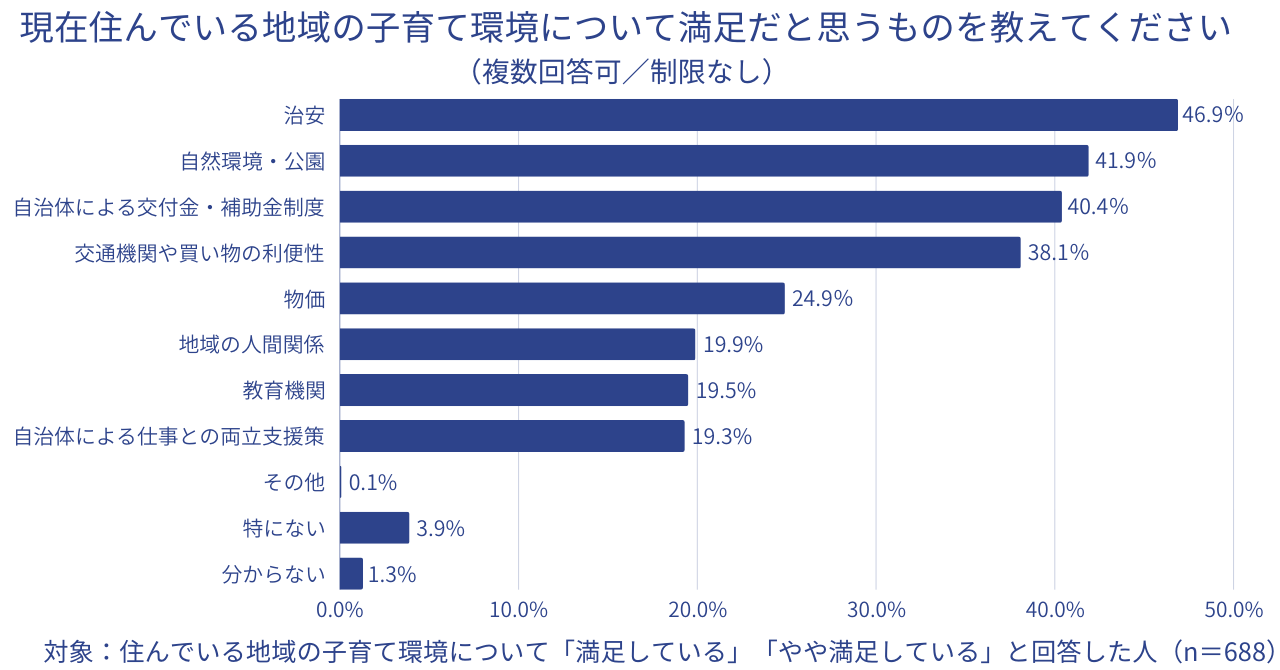 ◆ 現在住んでいる地域の子育て環境に満足しているのは64.7%。満足しているポイントは多い順に「治安」「自然環境・公園」「自治体による交付金・補助金制度」。