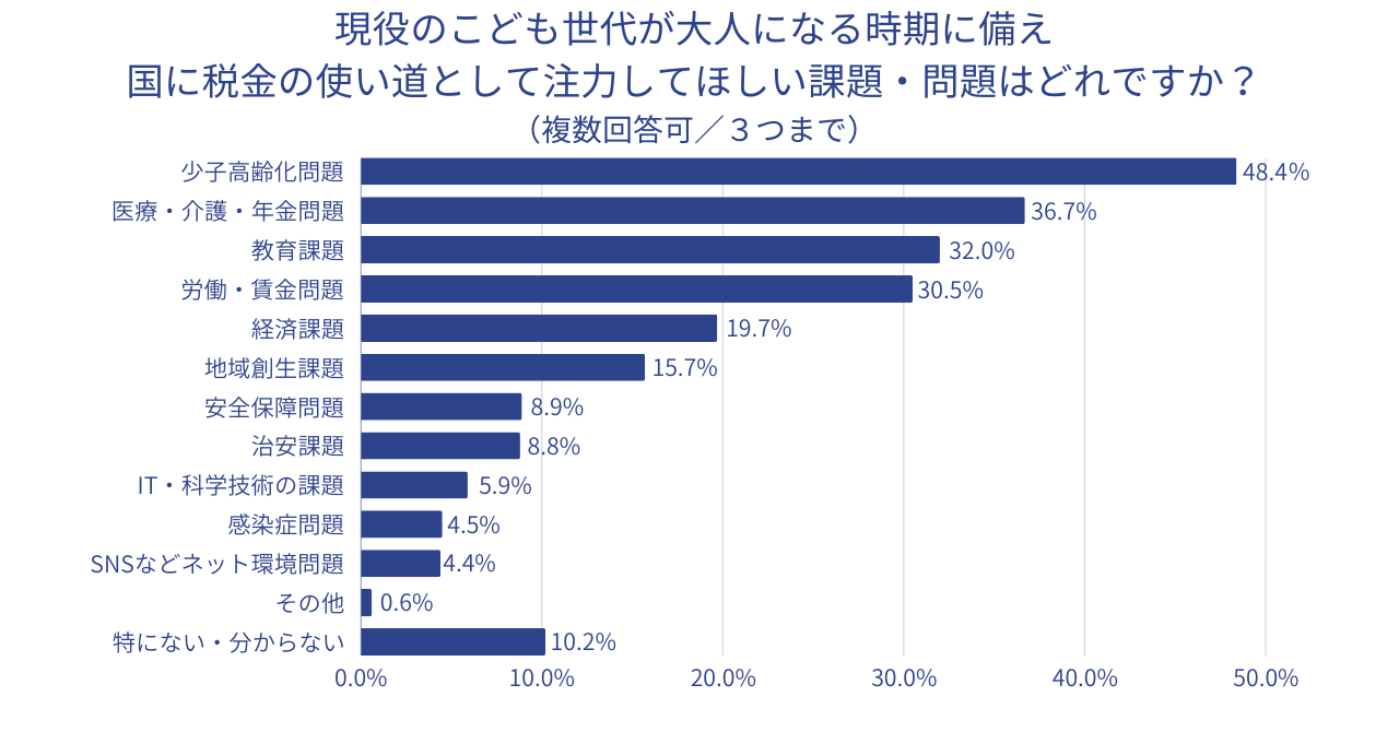 ◆ 現在の子ども世代が大人になる時期に備えて、国に税金の使い道として注力してほしい課題・問題は多い順に「少子高齢化問題」「医療・介護・年金問題」「教育課題」「労働・賃金問題」と続いた。