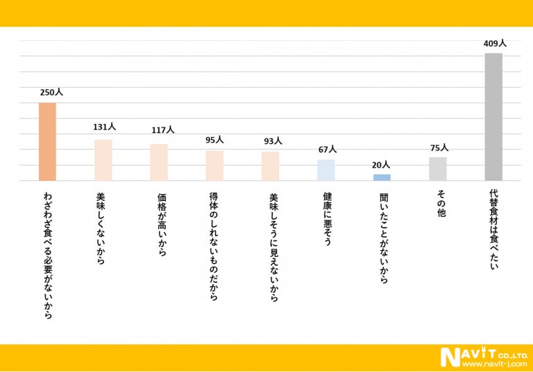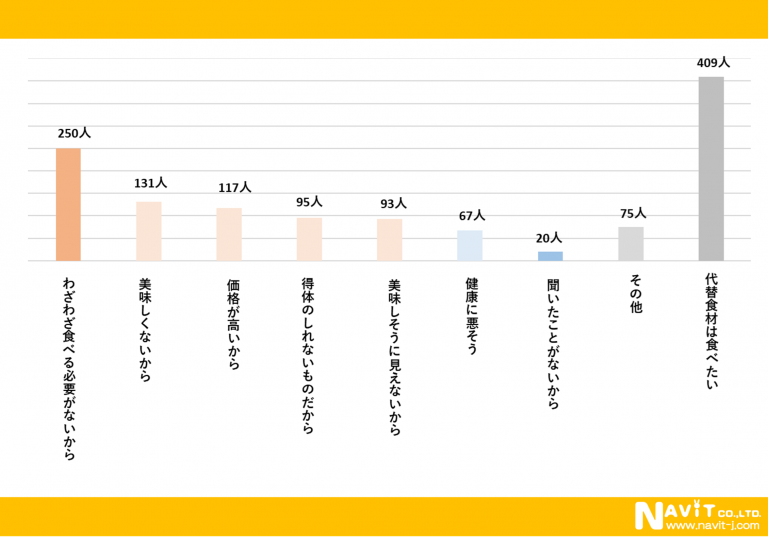 反対に、「代替食材を食べたくない理由は何ですか?」という質問を複数回答可で行ったところ、「わざわざ食べる必要がないから」が250人、「美味しくないから」が131人、「価格が高いから」が117人という順になりました。
