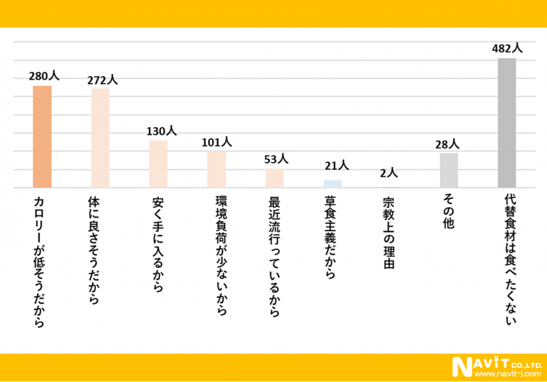 「代替食材を食べたい理由は何ですか?」という質問を複数回答可で行ったところ、「カロリーが低そうだから」が280人、「体に良さそうだから」が272人、「安く手に入るから」が130人という順になりました。