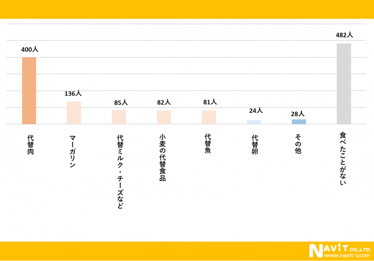 「どの様な代替食材を食べたことがありますか?」という質問を複数回答可で行ったところ、「代替肉」が400人、「マーガリン」が136人、「代替ミルク・チーズなど」が85人という順になりました。最近流行っている大豆ミートや、バターの代用品として便利なマーガリンを食べたことがある人は多いのかもしれませんね。
