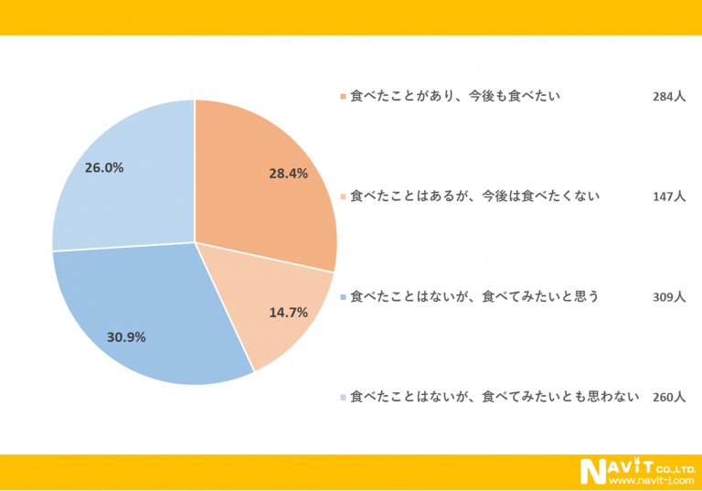 「代替食材を食べたことはありますか?」という質問を行ったところ、「食べたことがあり、今後も食べたい」が28.4%、「食べたことはあるが、今後は食べたくない」が14.7%という結果になり、合わせると食べたことがある人は43.1%ということが分かりました。