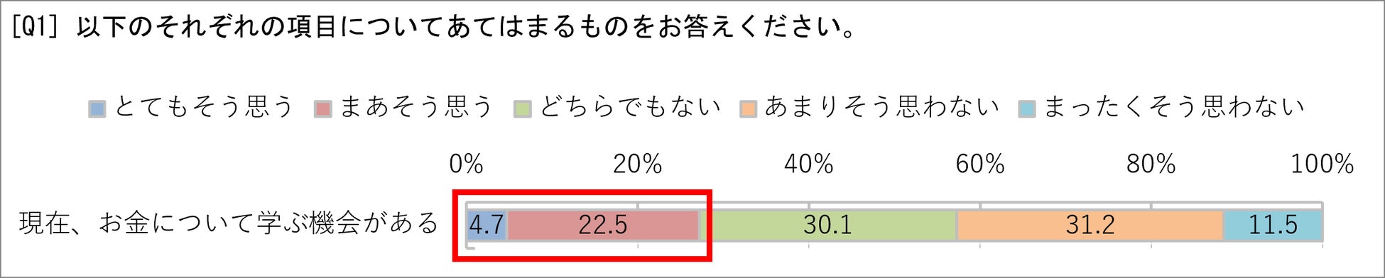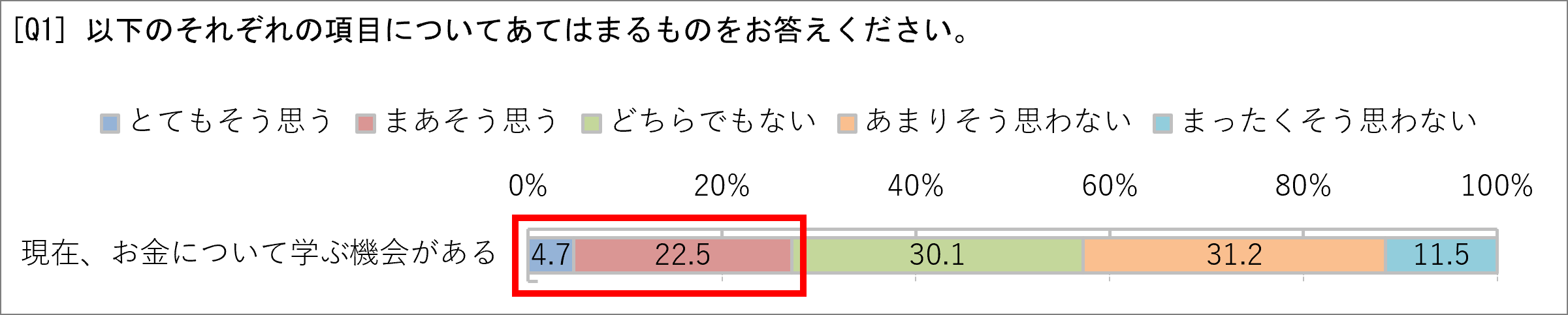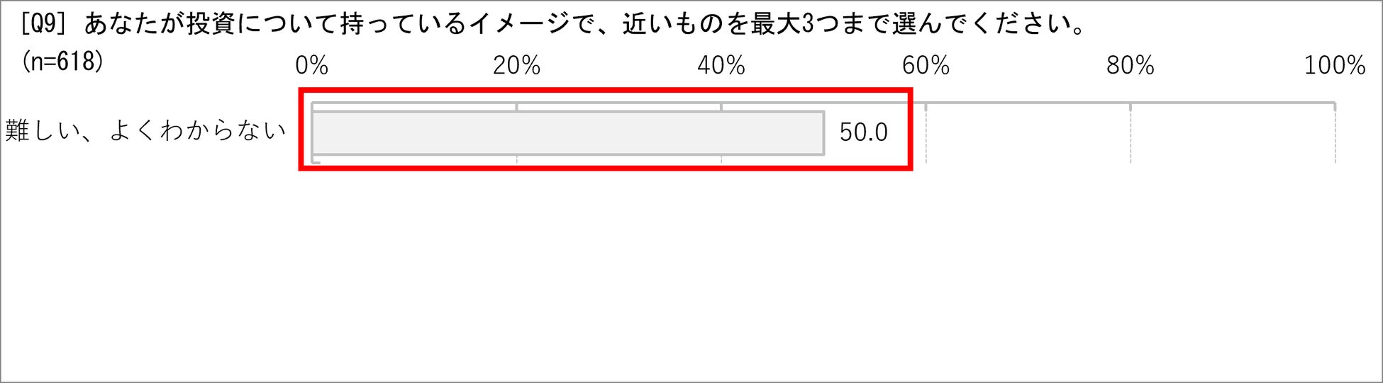 さらに、投資についてのイメージでは、「お金についての知識が重要だと思う」と回答した高校生が87.7%にのぼったのに対し〈Q1〉、投資のイメージについては50.0%の高校生が「難しい、よくわからない」と回答しており〈Q9〉、また「お金について学ぶ機会がある」と回答した高校生は27.2%に留まるなど、高校生世代の投資教育がまだまだ進んでいない現状も明らかになりました。